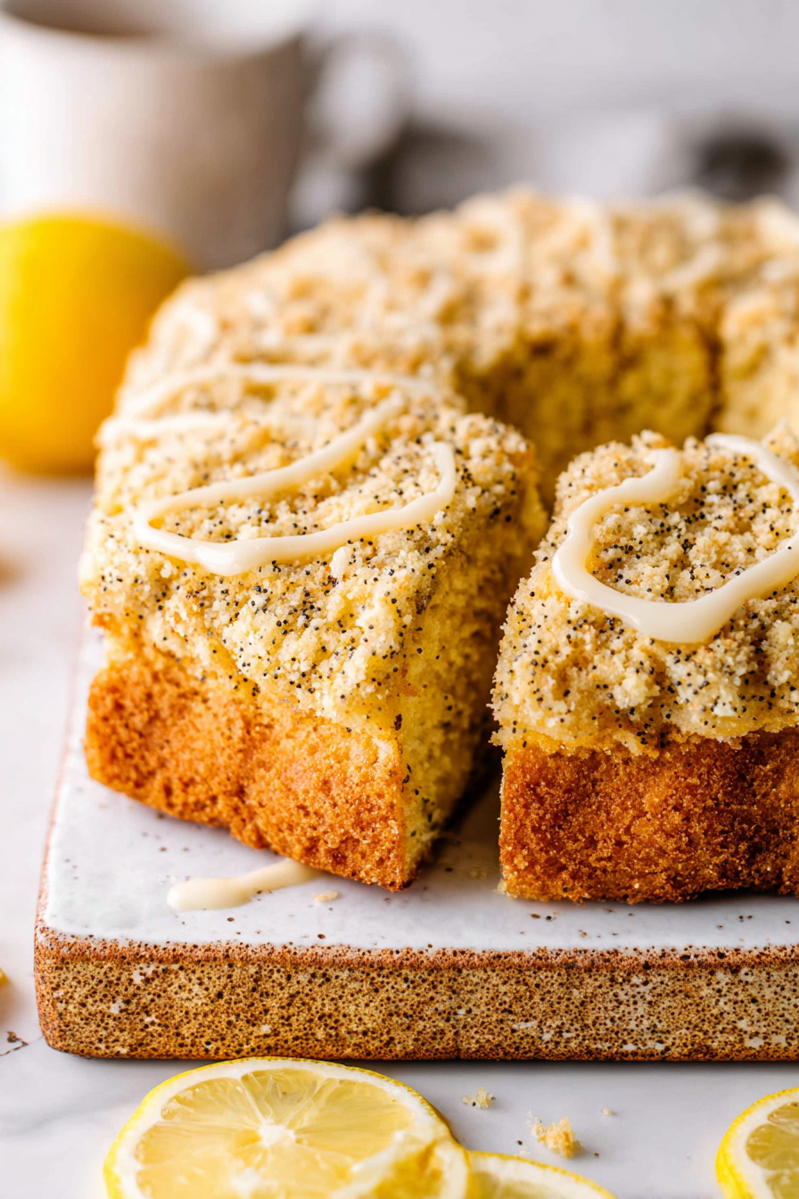 This lemon poppyseed coffee cake is the kind of thing that makes mornings feel like a tiny celebration. Bright lemon, a tender crumb studded with poppyseeds, and a slightly crunchy streusel/glaze situation on top — perfect with terrible morning hair and very good coffee. It’s not fussy, but it looks like you tried, which is my favorite kind of baked good.