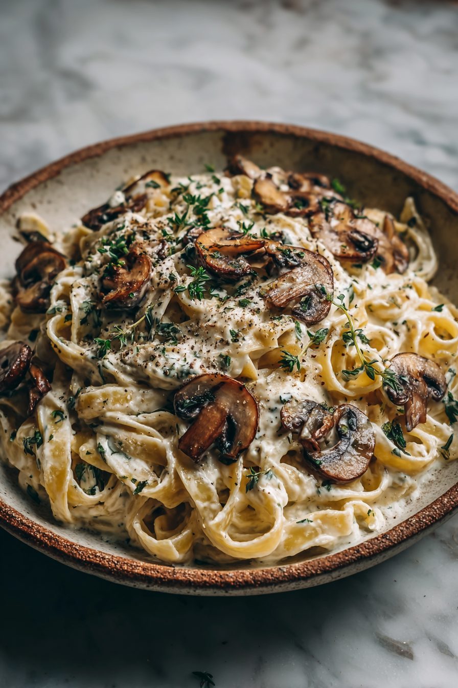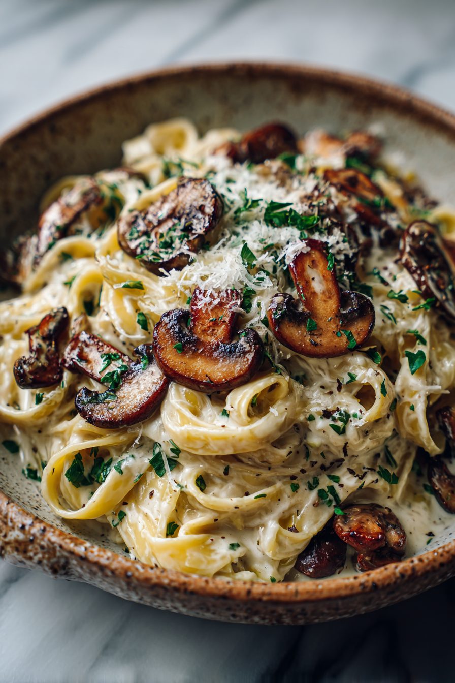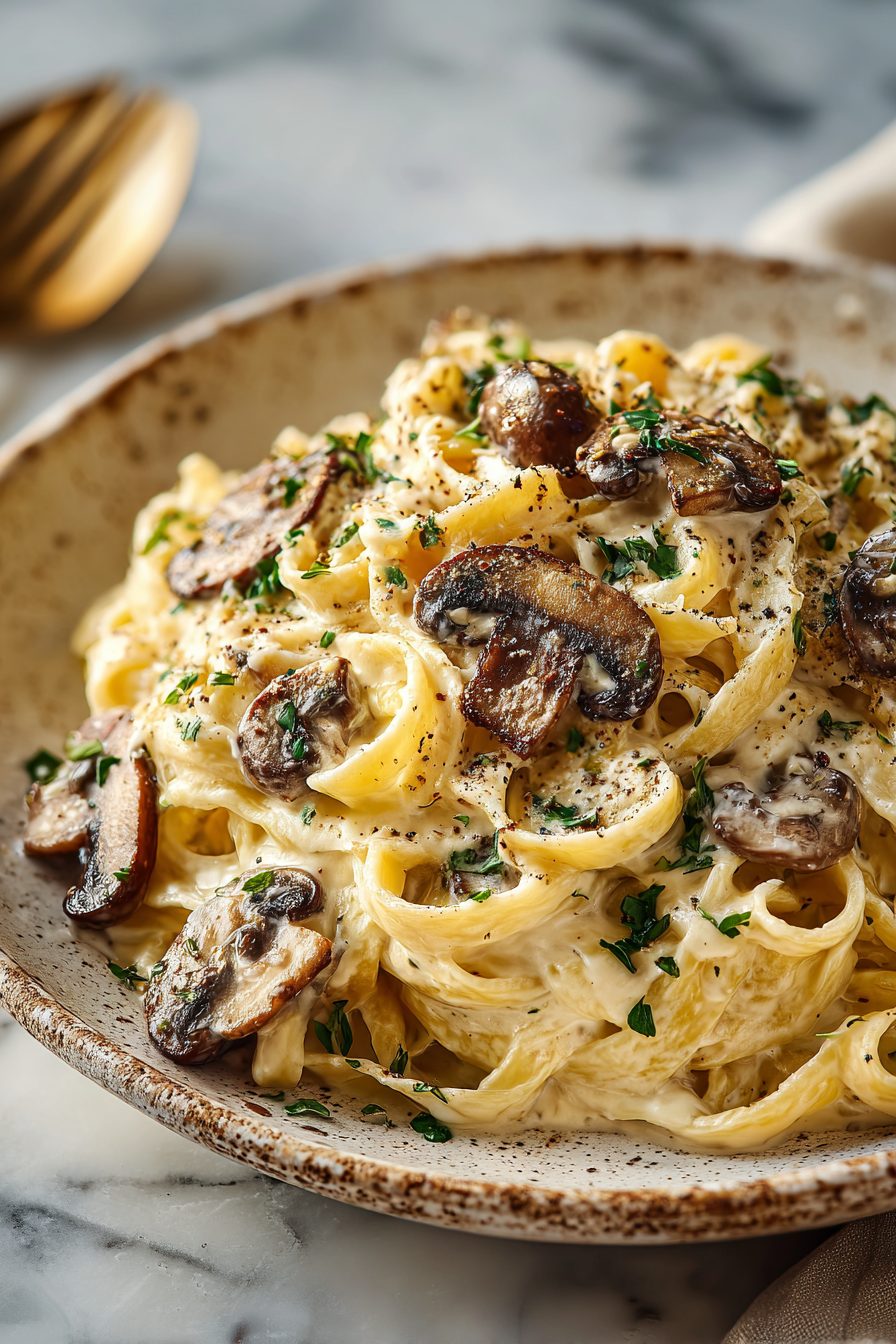 Creamy, comforting fettuccine tossed with golden mushrooms and a silky Parmesan Alfredo sauce. Weeknight-simple, restaurant-cozy.