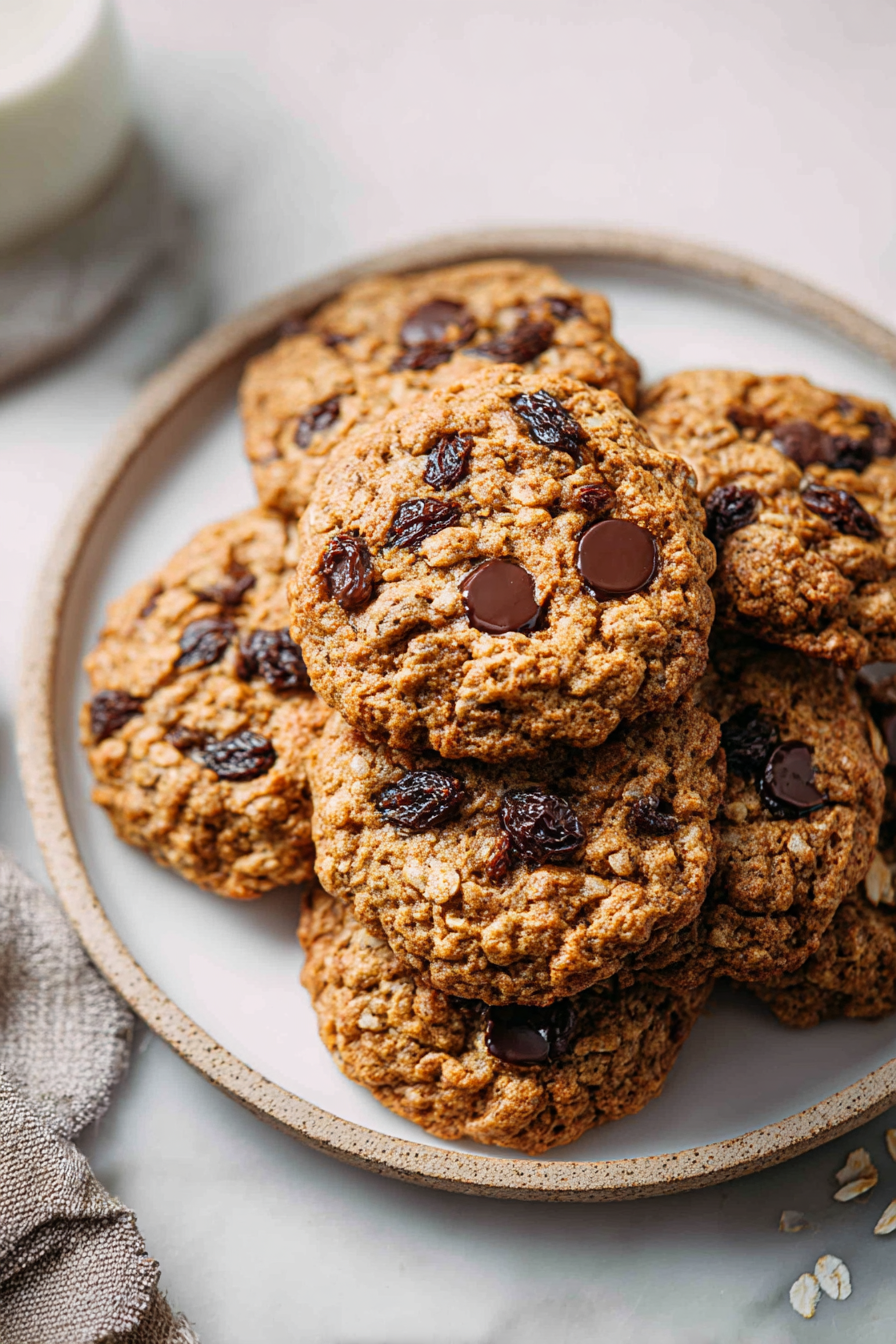 My husband calls these “danger cookies” because one tray on the counter means he’ll eat three before coffee. The kids help dump the oats in and then immediately fight over who gets to lick the spoon. Once I forgot the raisins and added extra chocolate chips — declared a genius move by child no. 2 — and now sometimes I do half-and-half. It’s messy, imperfect, and every single bite comes with a satisfied groan.