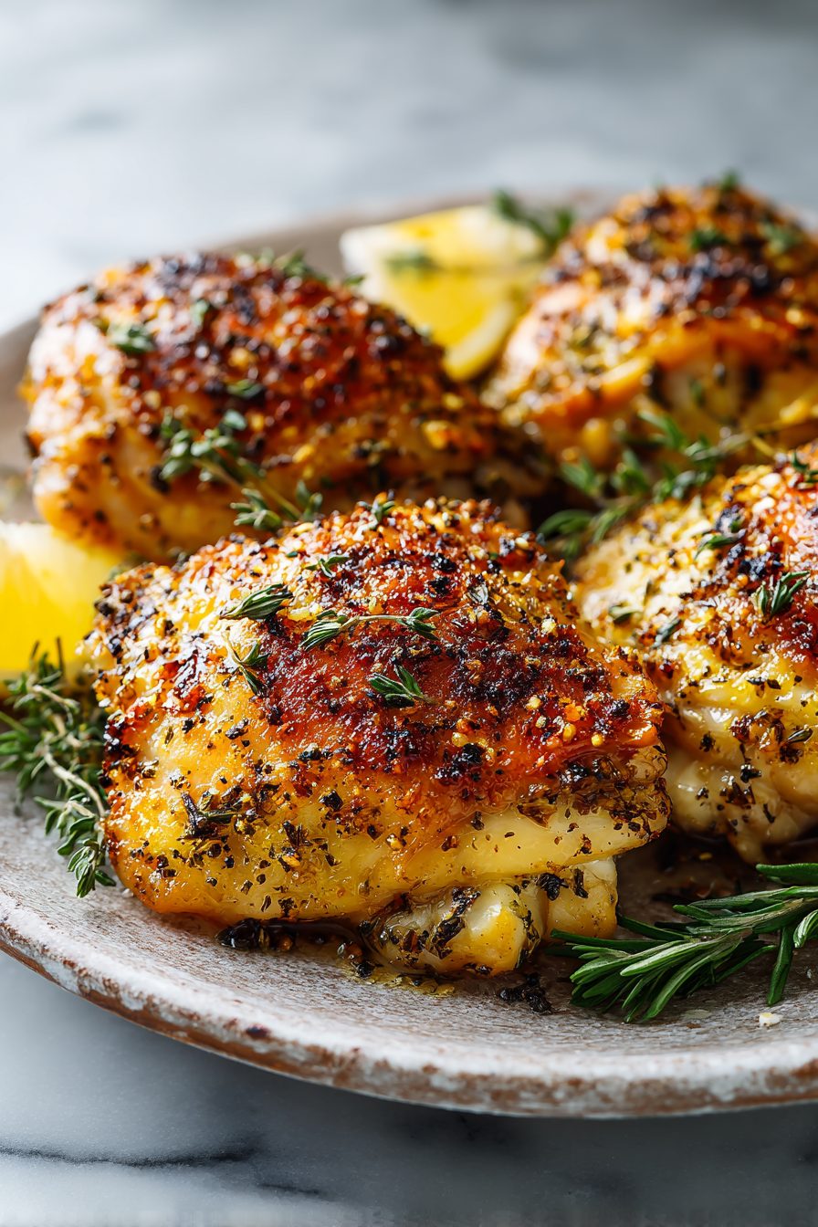 I’ll be honest — I used to be convinced oven chicken was boring until I discovered the 425°F magic zone. The first time I left the thighs too close together, they steamed and sulked instead of crisping, and my husband refused to eat them (rude). After that I learned patience: space them out, pat them dry, and resist the urge to flip them every five minutes. Also, a quick broil at the end is like a tiny culinary mic drop. I once swapped the salt for smoked salt on a whim and the whole dish turned smoky and amazing — the kids didn’t notice, and my in-laws were impressed. Ignore recipes that tell you to skip the lemon; the acid brightens the whole thing.
