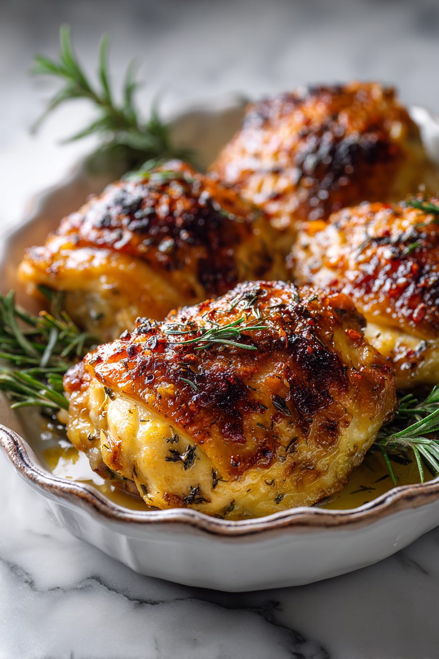 This is the kind of dinner that makes the whole kitchen smell like home: juicy, skin-on chicken thighs roasted until the skin is the perfect mix of crackly and tender, with a simple spice rub and a little lemon brightness to cut through the richness. It’s unfussy, forgiving, and somehow feels both fancy and totally weekday-appropriate. You should try it because it’s one of those meals that looks like effort but really isn’t — and it reheats like a tiny miracle.