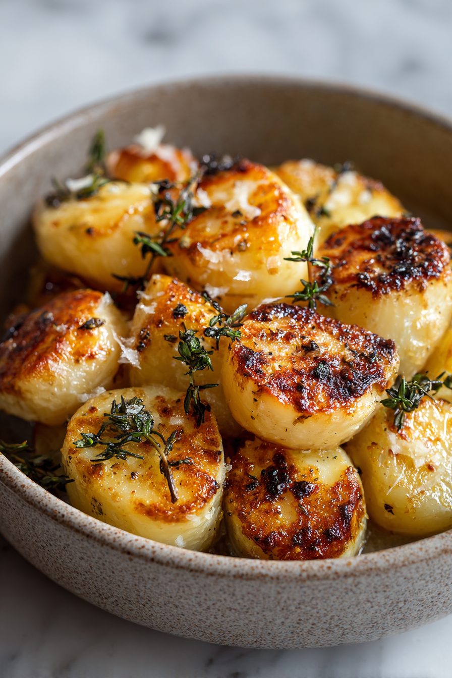This is one of those side dishes that somehow looks fancy but is secretly the laziest thing on the tray. We’re talking roasted turnips—golden at the edges, a little sweet, a little earthy—tossed with thyme that gets crackly and fragrant, then showered with Parmesan so you hit creamy-salty in every bite. If you think you don’t like turnips, I get it. But roast them right and they go from “meh” to “where have you been all my life?”