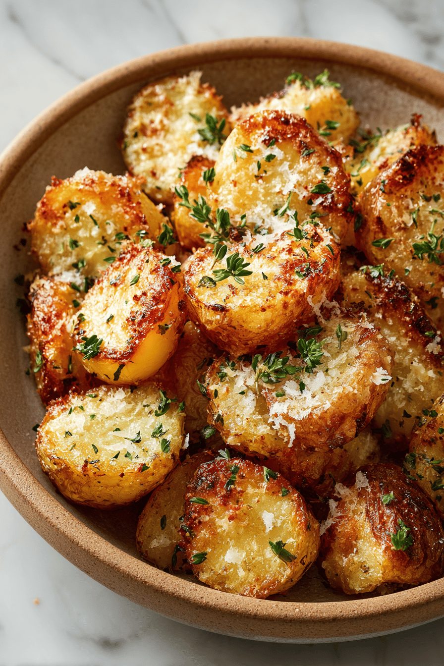 I am unabashedly obsessed with these potatoes — crispy little clouds with salty Parmesan crust and that throw-together charm that makes people think you slaved all afternoon. They’re roasted until golden, tossed with garlic and herbs, and somehow comforting and fancy in the same bite. If you want a side that gets rave reviews with almost zero fuss, this is it.