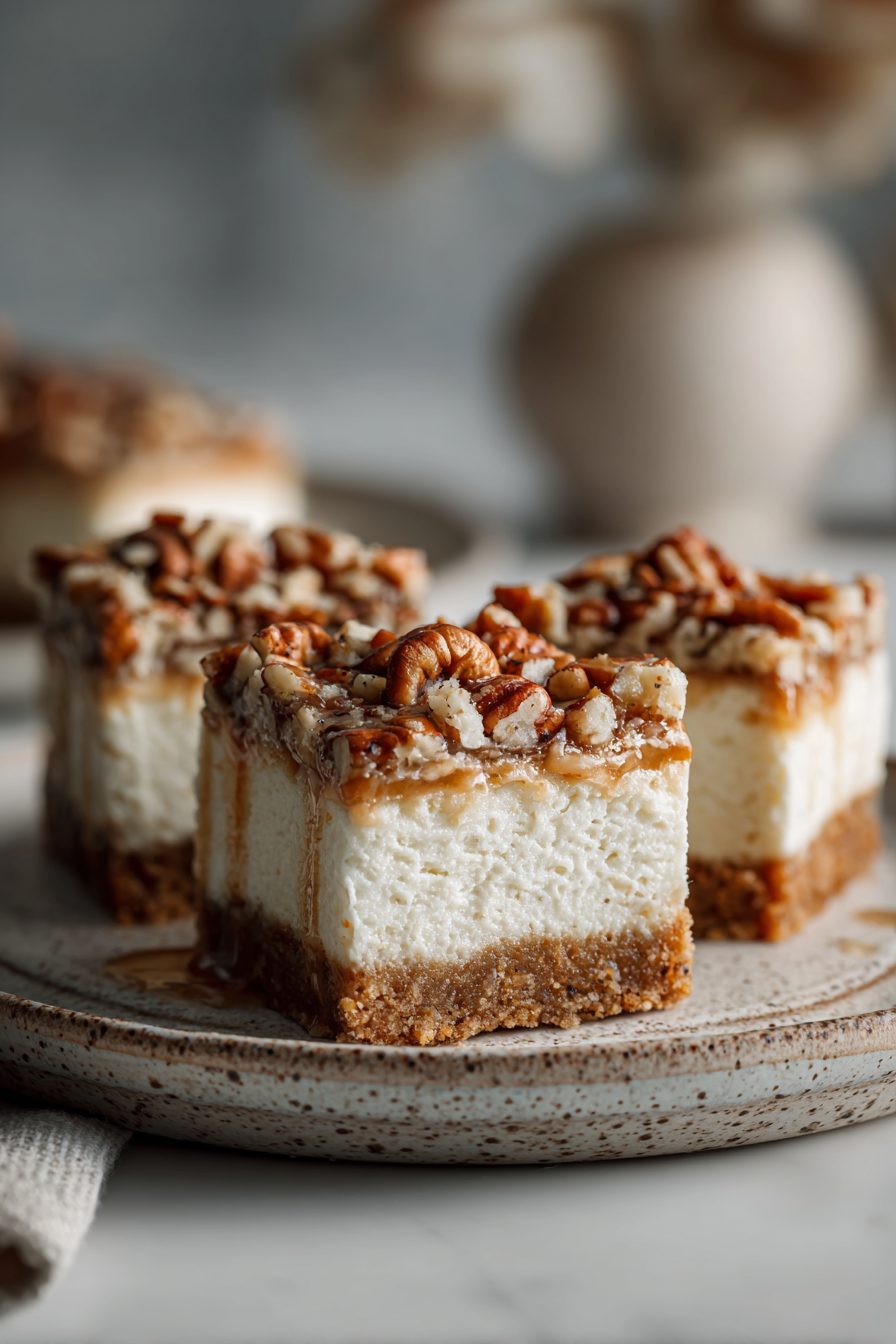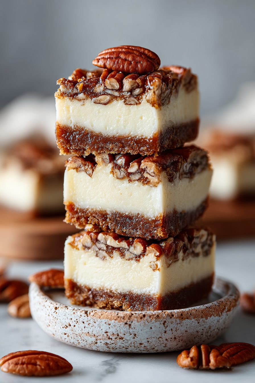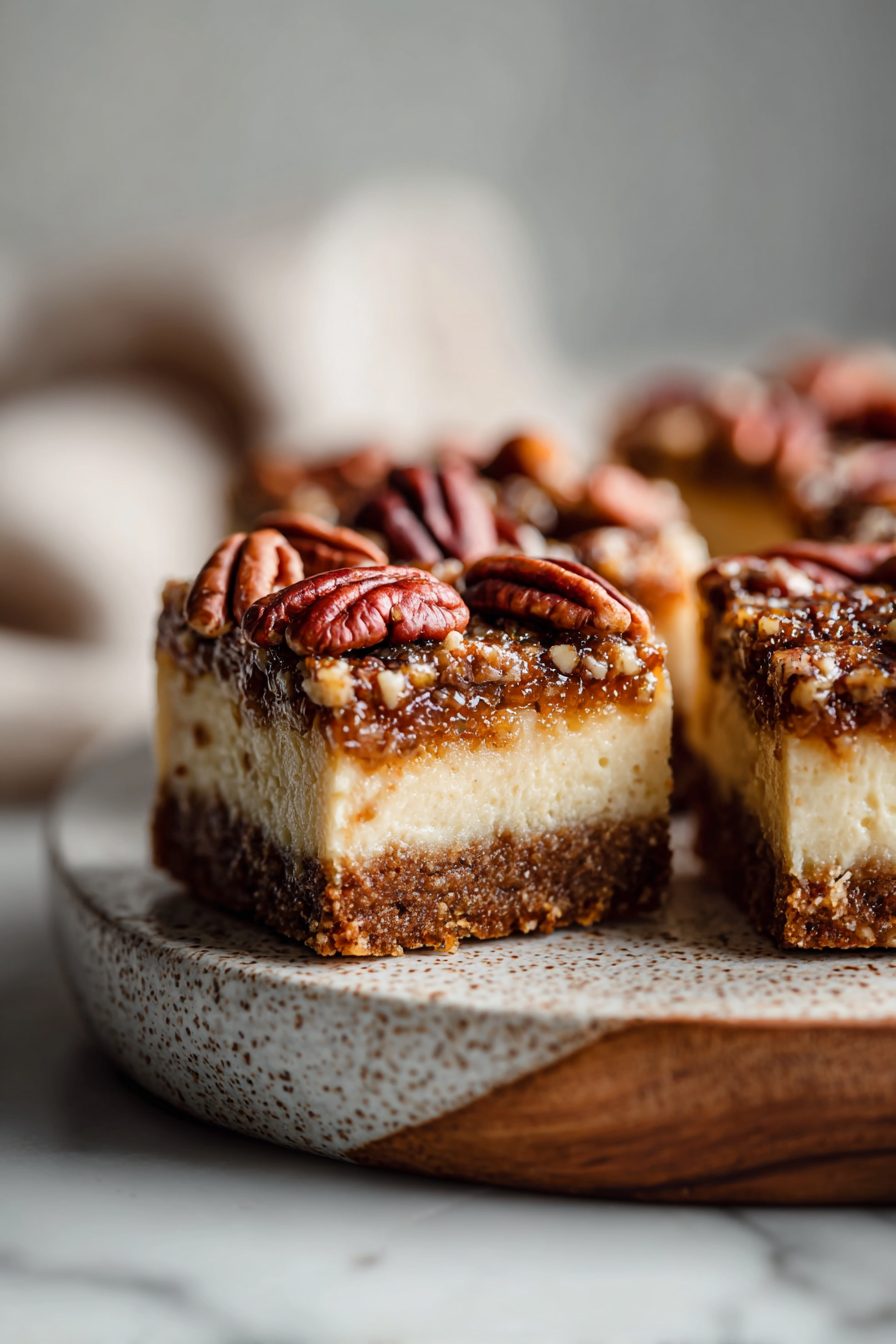 This is my go-to dessert when I want something that feels fancy but really isn’t — pecan-studded, tangy cheesecake baked on a buttery cookie-like crust and cut into messy, perfect bars. It’s the kind of treat that shows up at potlucks, disappears at brunch, and makes random weeknights feel like a celebration. Texture-wise you get a crumbly base, creamy cheesecake middle, and a caramel-y pecan topping that crunches just right.