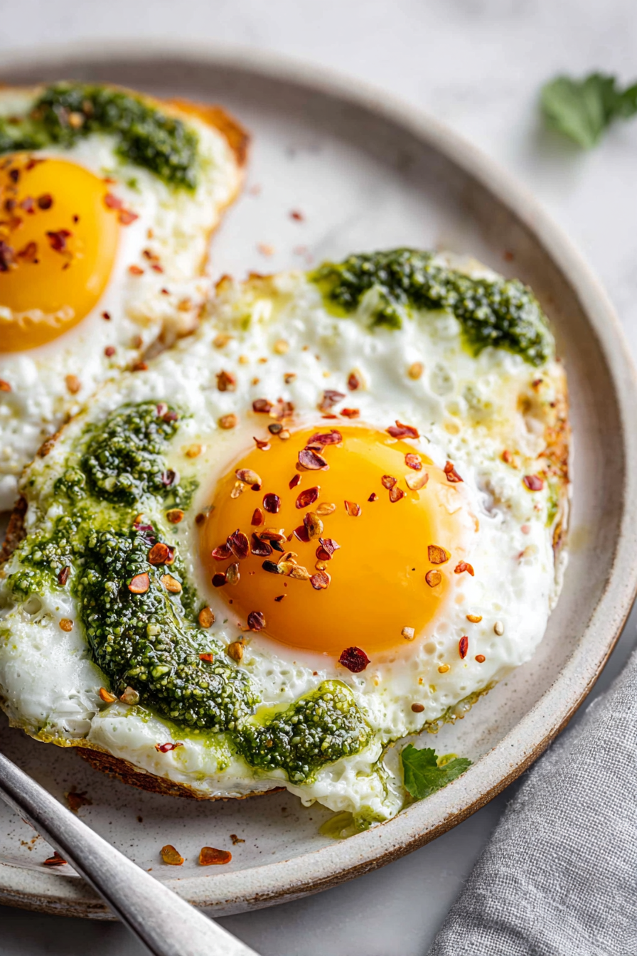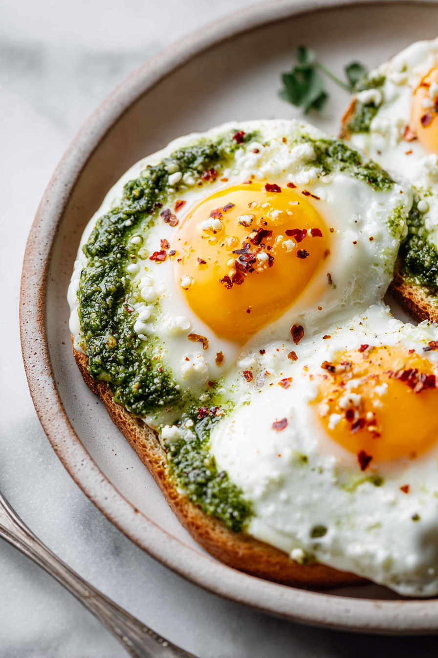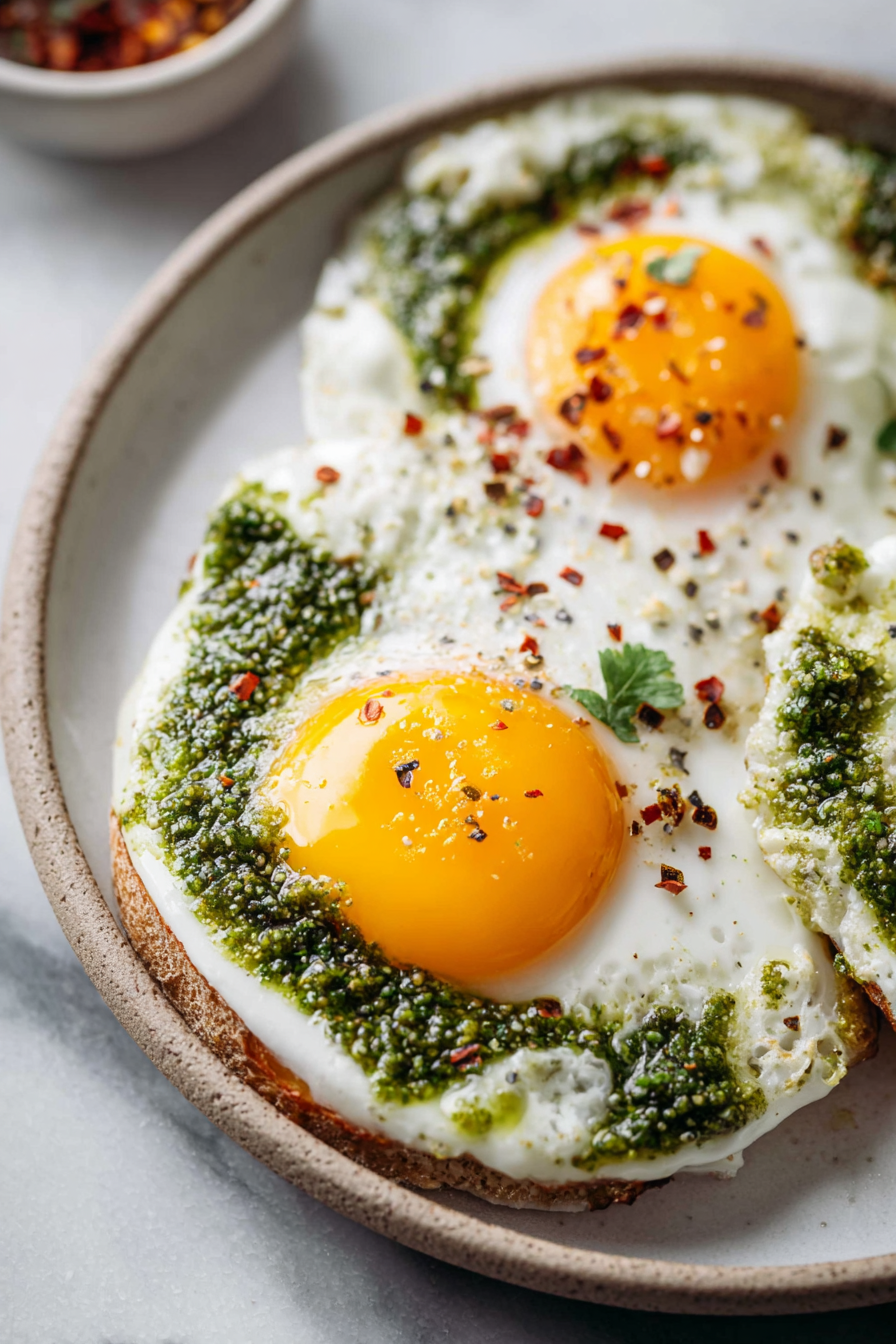 If you’re using a pesto that’s heavy on cheese, keep the heat lower—ask me about the time I turned it into a smoky basil crime scene. Nonstick pan is your friend here. I’ve cracked eggs straight into a pesto puddle and also spread pesto on toast first—both hit, but cooking in the pesto gives those crispy, frico-y edges that make me feral. Tried it with chili crisp once, thinking fusion! Turns out I still prefer the basil, but a tiny drizzle on top after cooking? Yes. Also, if your pesto is thick, thin it with a breath of olive oil so it spreads and doesn’t scorch. And if a yolk breaks, call it “bruschetta eggs” and carry on like it was the plan.