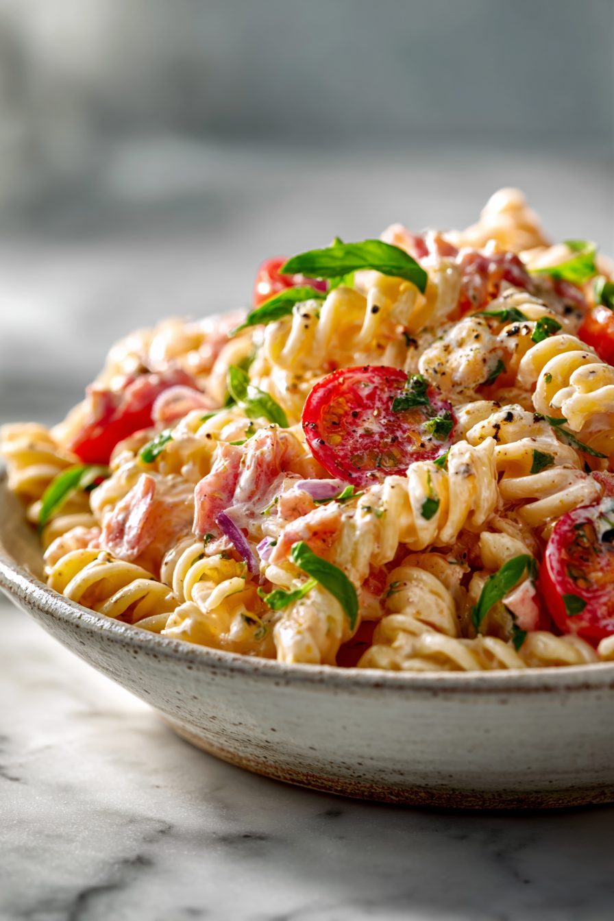 This pasta salad is the kind of thing that shows up at cookouts and then mysteriously disappears before the burgers are even done. It’s creamy, bright, slightly nostalgic (hello 90s deli vibes), and that playful pink sauce makes it feel like a party in a bowl. It’s not precious — perfect for potlucks, weeknight dinners, or when you need to look like you tried but really just dumped things together carefully.