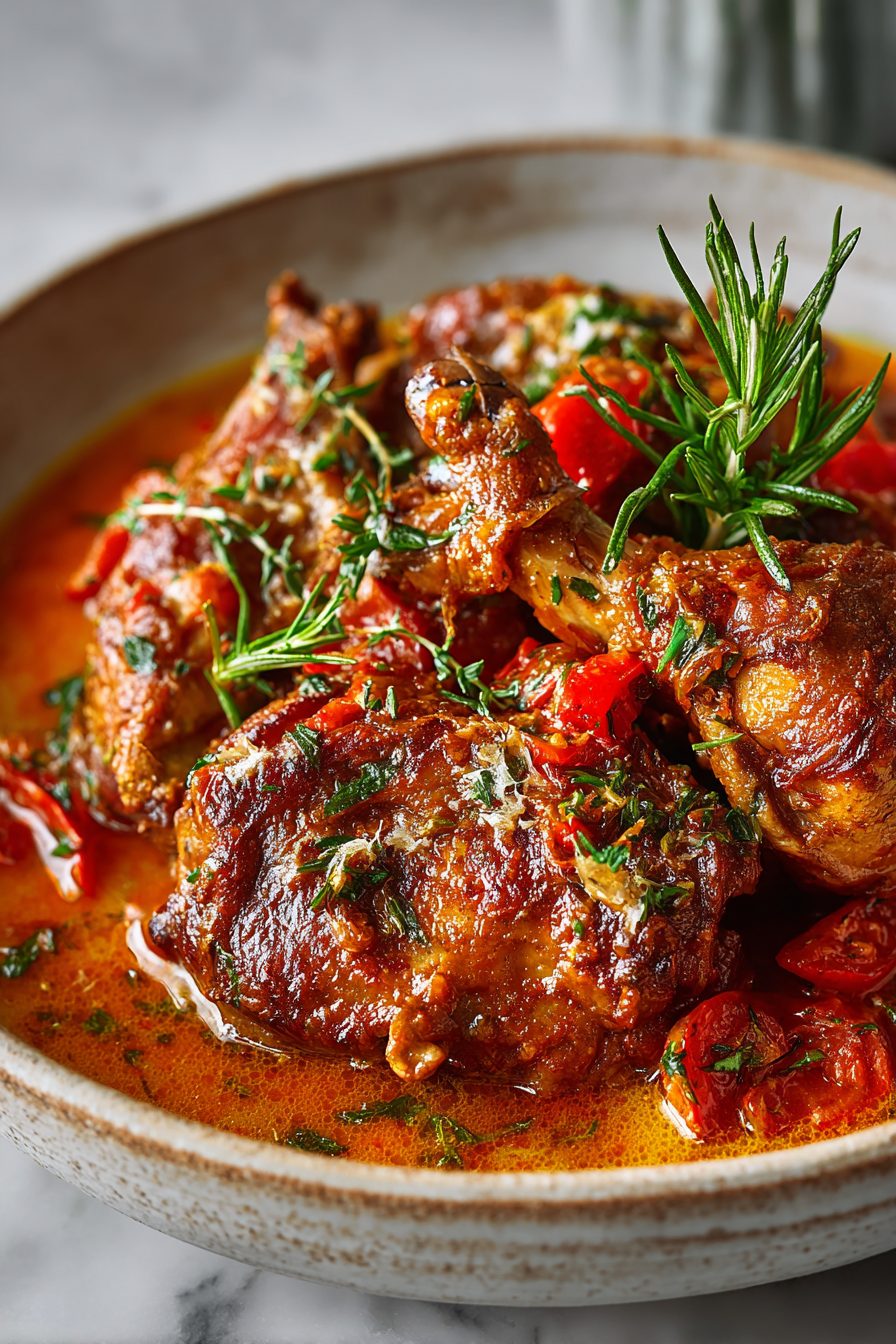 This rabbit cacciatore is the kind of rustic, cozy dish that makes your kitchen smell like someone’s grandma just moved in — slow-simmered tomatoes, wine, herbs, and tender braised rabbit that falls off the bone. It’s bright from bell peppers and capers, earthy from mushrooms (if you use them), and somehow both light and deeply comforting. Give it a try if you want something old-school and a little different from the usual chicken dinner.