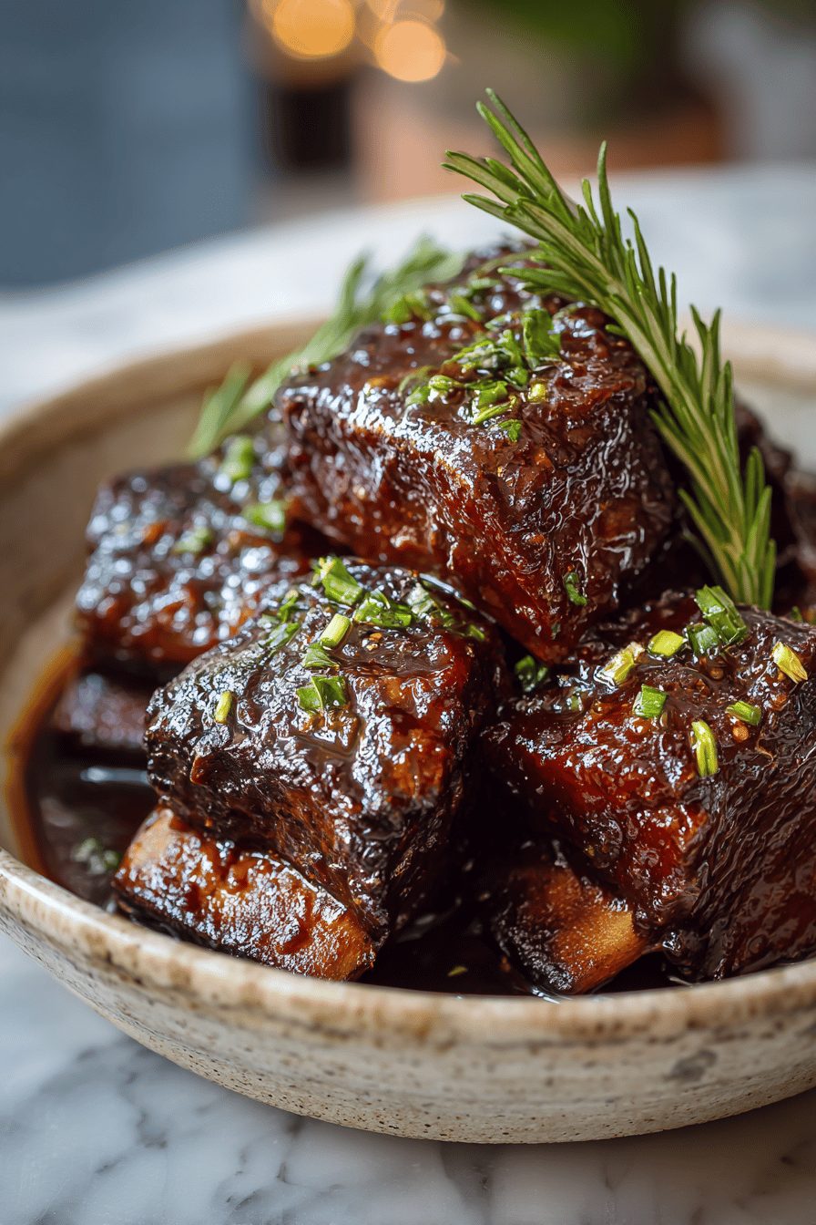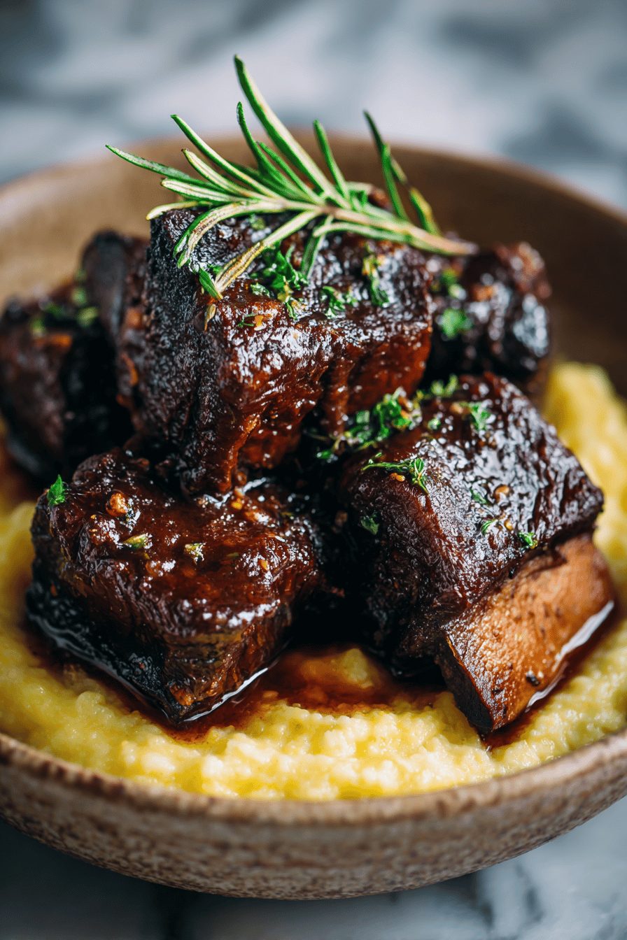 Tender, fall-off-the-bone short ribs braised low and slow in a rich red wine sauce with herbs and aromatics.