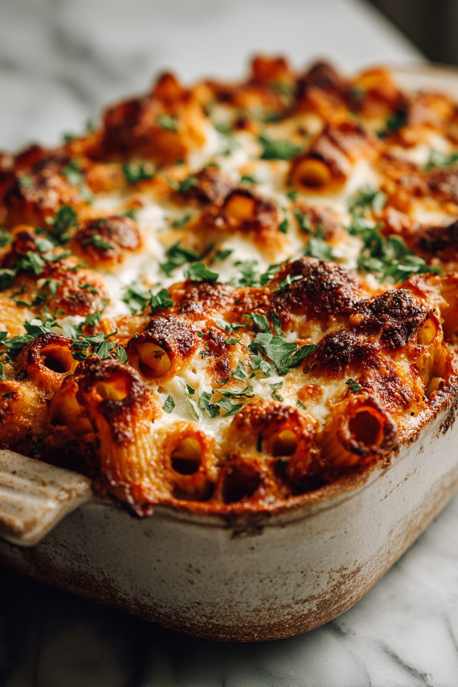 This baked rigatoni is the kind of dinner that arrives smelling like pure comfort and refuses to be boring: saucy, cheesy, slightly browned on top, and kind of smugly satisfying. It’s basically hearty pasta baked up with a rich tomato-meat sauce and a golden cheese crust — the kind of thing that makes everyone linger at the table and ask for thirds.
