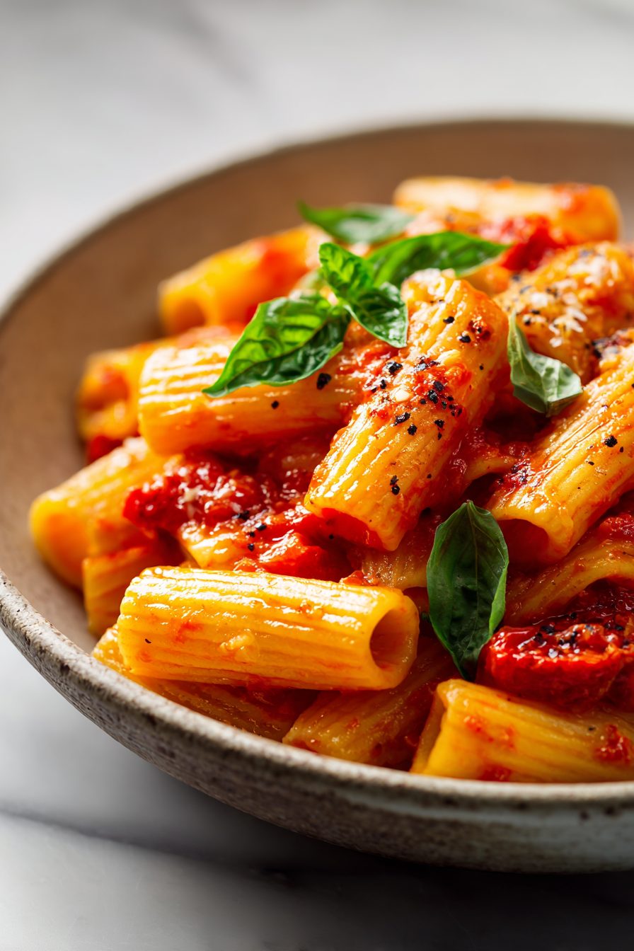 My little family fights over the crispy rigatoni ends. My husband claims he’ll “only have a few forkfuls” and then eats half the pan. The kids call it “red sauce party pasta” and demand extra parmesan like it’s currency. This started as my emergency-dinner move when the fridge looked scarce and a jar of tomatoes and a head of garlic saved us. Now it’s our Friday comfort dish—easy, a little spicy, and ridiculous to mop up with bread.