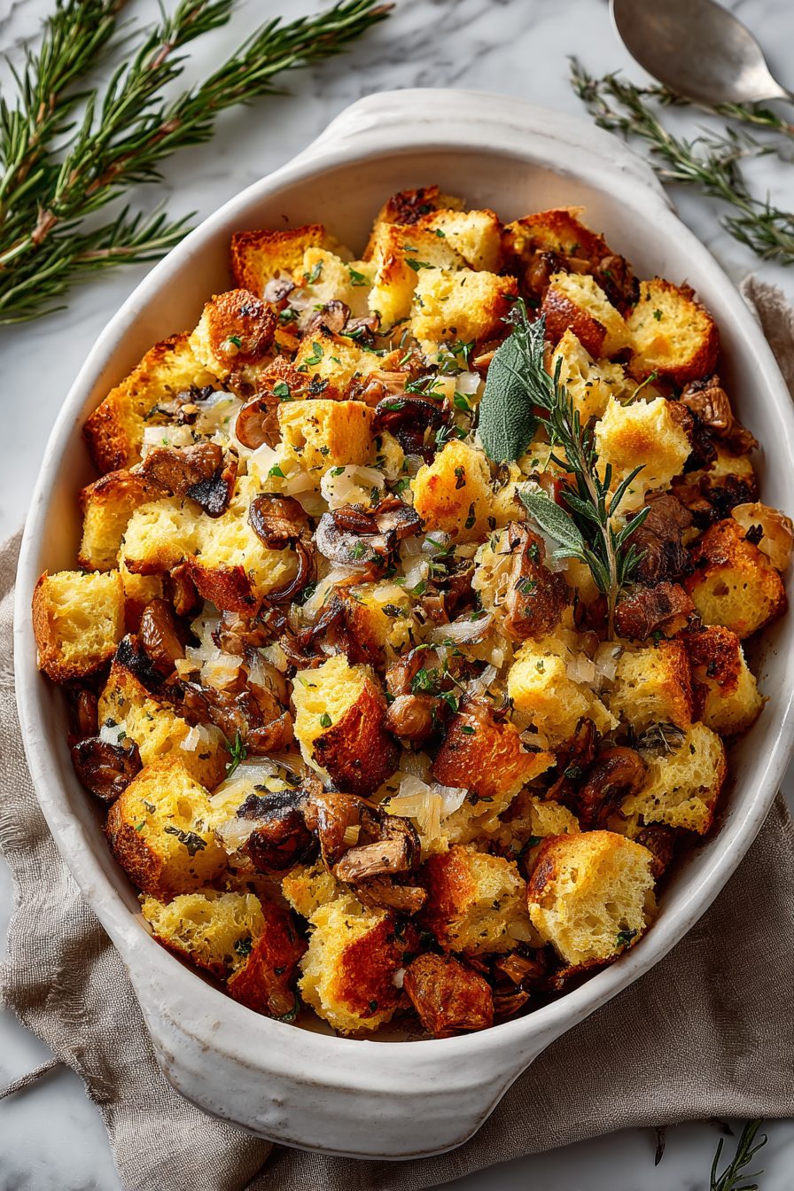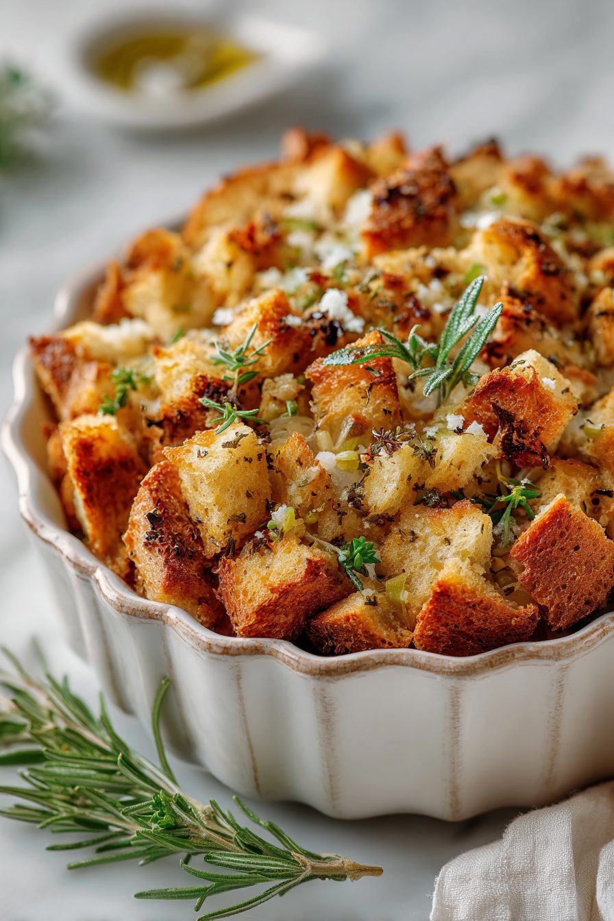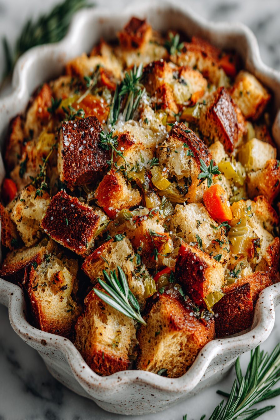 – Fruit/nuts → Toss in apples, dried cherries, or toasted walnuts for texture and contrast; don’t go crazy or it becomes a dessert pretending to be stuffing.