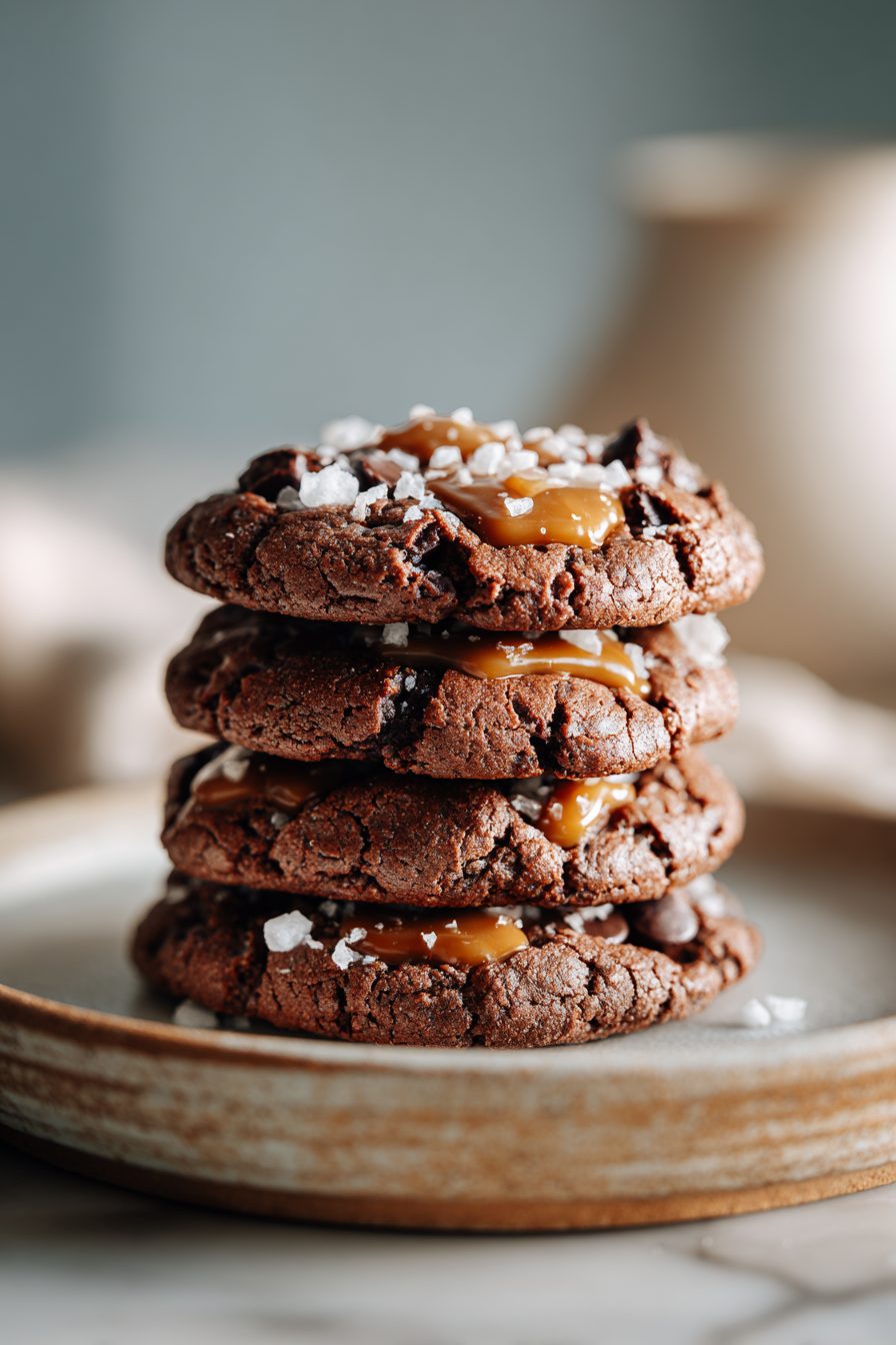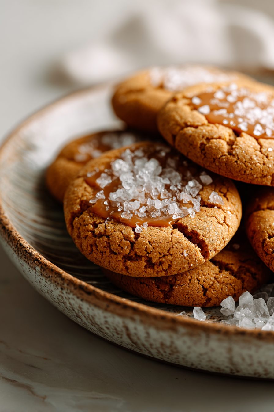Chewy brown sugar cookies packed with soft caramel and finished with flaky sea salt. They mix fast and bake in minutes.