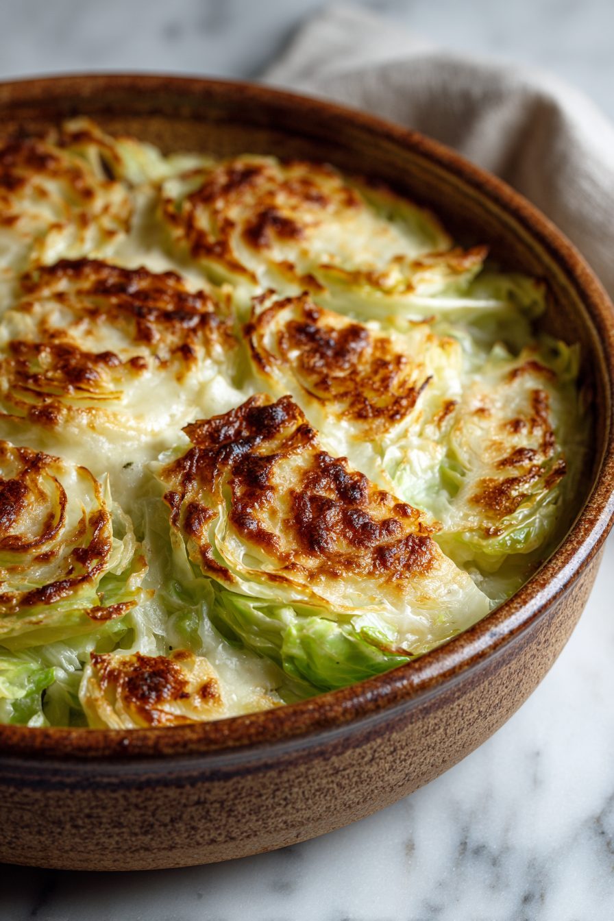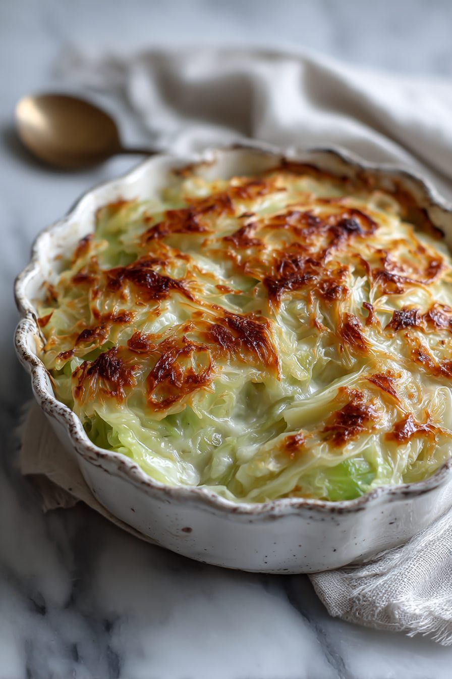 This dish is basically cabbage dressed up in its Sunday best — thinly sliced, smothered in a creamy, slightly cheesy sauce, and baked until the edges are golden and gloriously crisp. It’s not fussy, it’s surprisingly cozy, and it’s one of those things that turns plain old cabbage into something people ask about at dinner (yes, really).