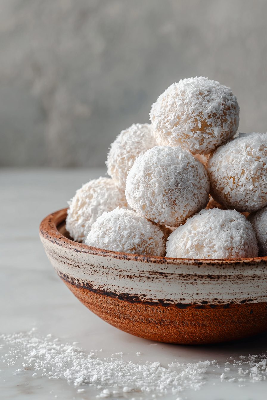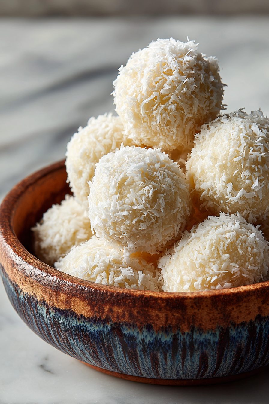 - Scoop heaping tablespoon mounds onto the pans. Roll each in coconut to coat all sides.