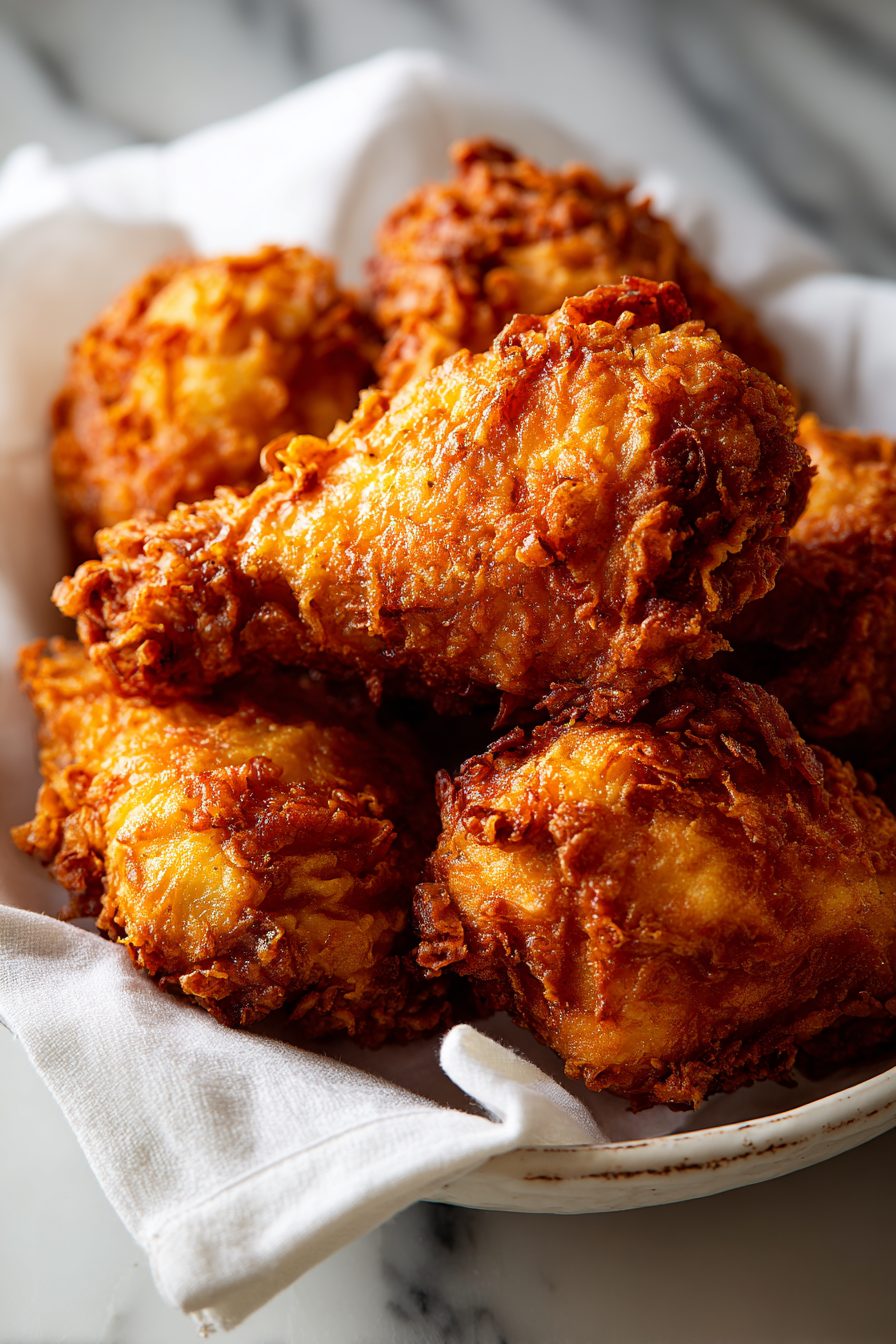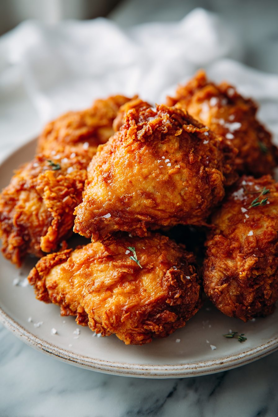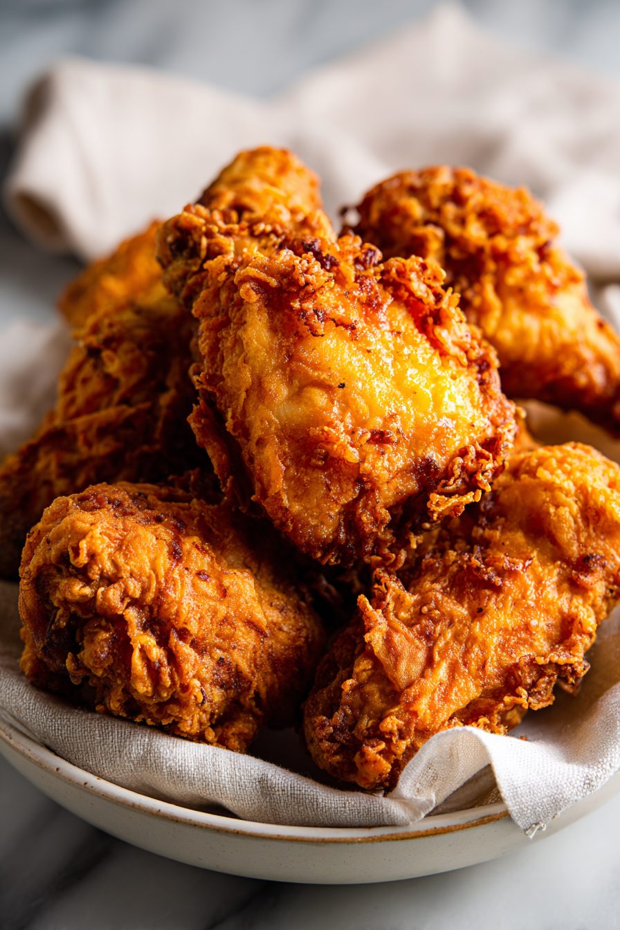 This is the crispy, craggy, golden Southern fried chicken you dream about when the group text turns into “what should we eat?” chaos. It’s all about a deeply seasoned buttermilk bath and a batter that’s light but nubbly, so you get those little fried ruffles that shatter when you bite. The inside stays juicy (like, dangerously juicy), and the seasoning runs all the way through—not just sprinkled on top. It’s simple enough for a Sunday, bold enough for a backyard hang, and honestly? Worth heating up the kitchen.