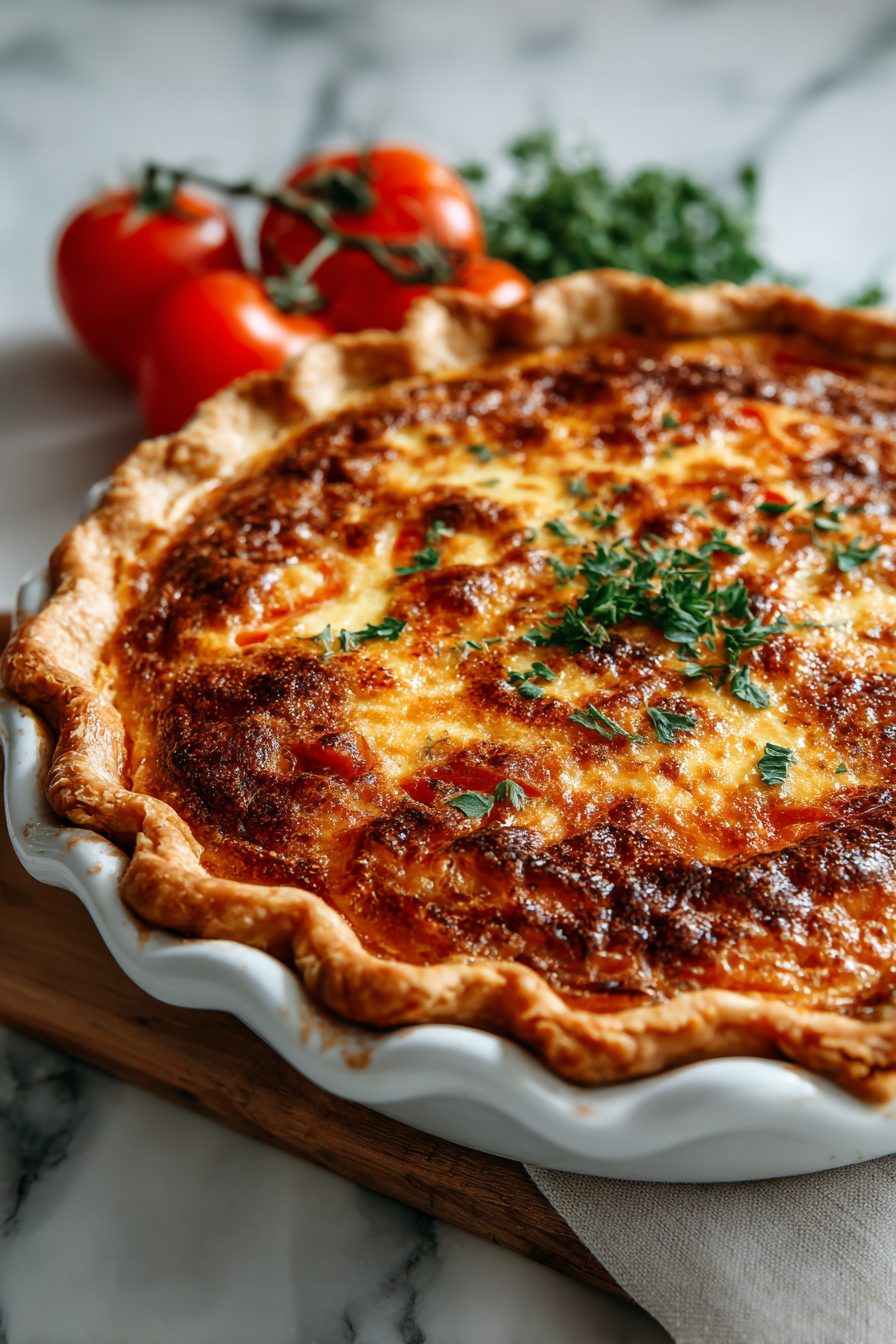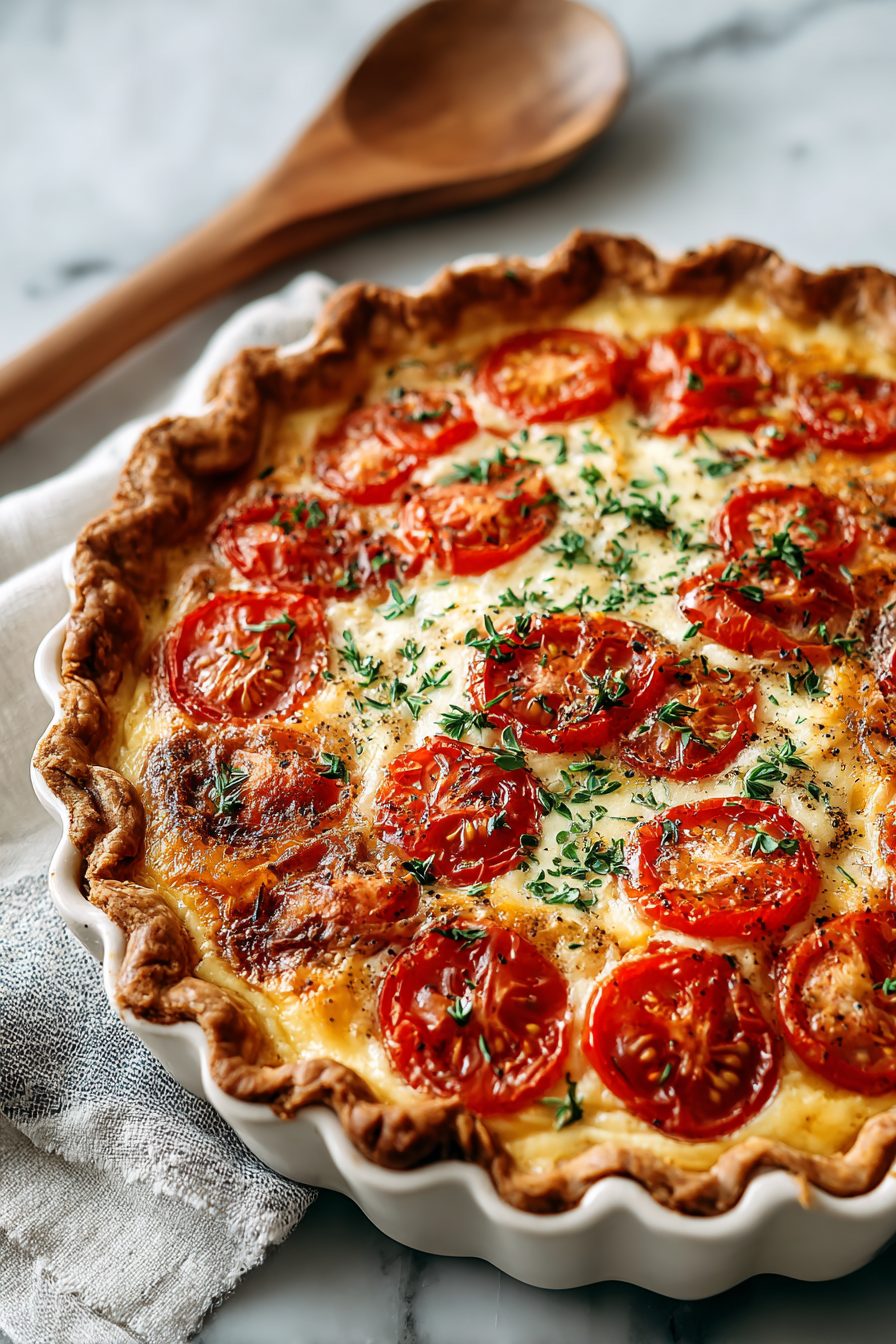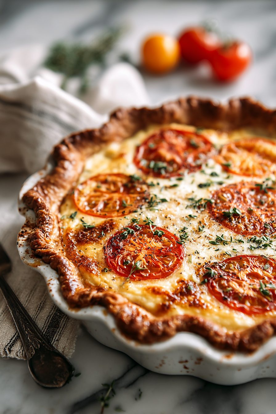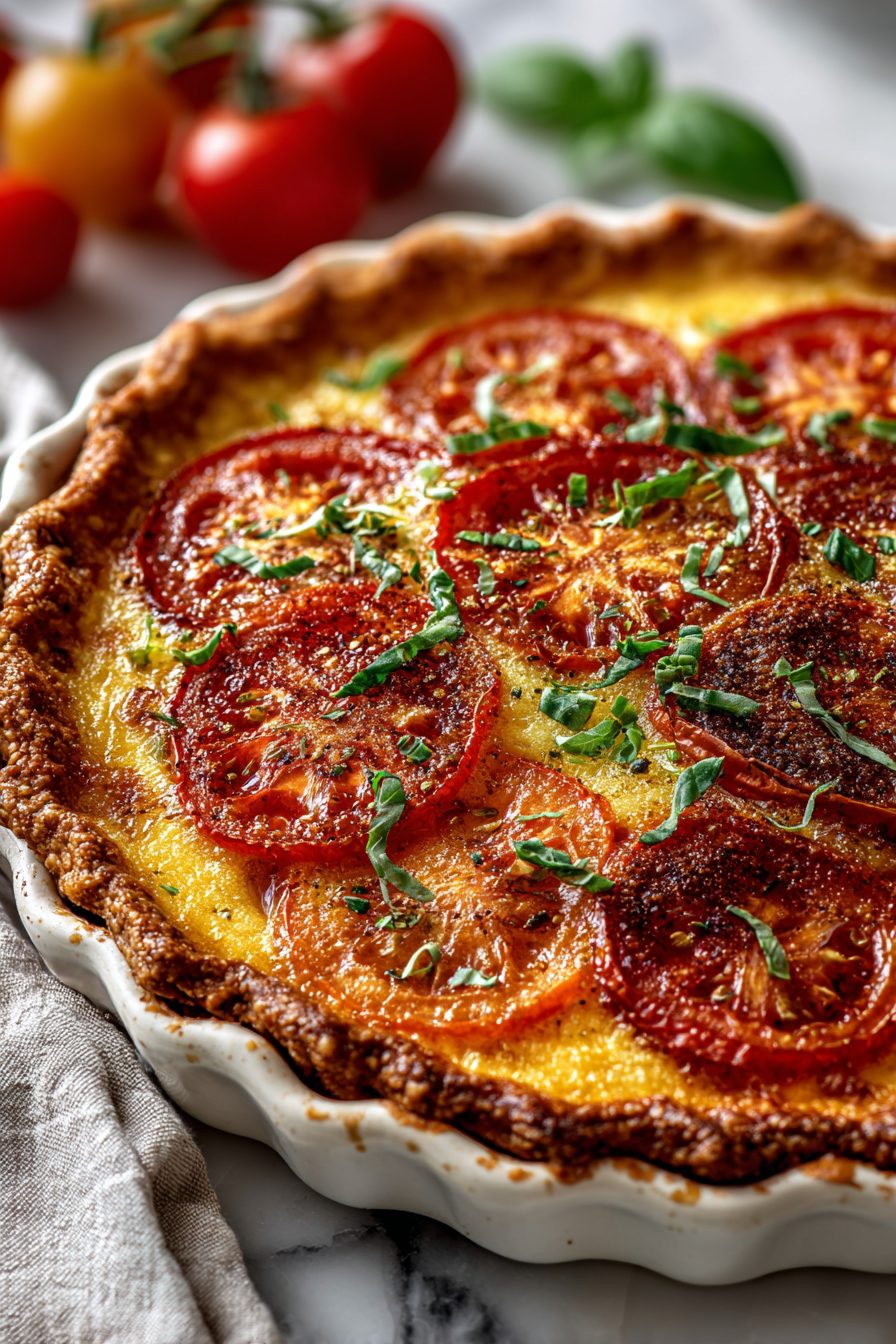 My husband calls this “the pie that breeds loyalty.” He’ll literally walk into the kitchen from nowhere if he smells basil and tomatoes, and our kid insists on calling it “cheesy tomato cake.” We started making it on slow Sundays and now it’s our emergency hosting dish — people always show up, deliberately hungry. Once I forgot to blind-bake the crust (rookie move) and it still turned out decent because the filling was so bold; we ate it with a bottle of cheap white wine and pretended I did it on purpose.