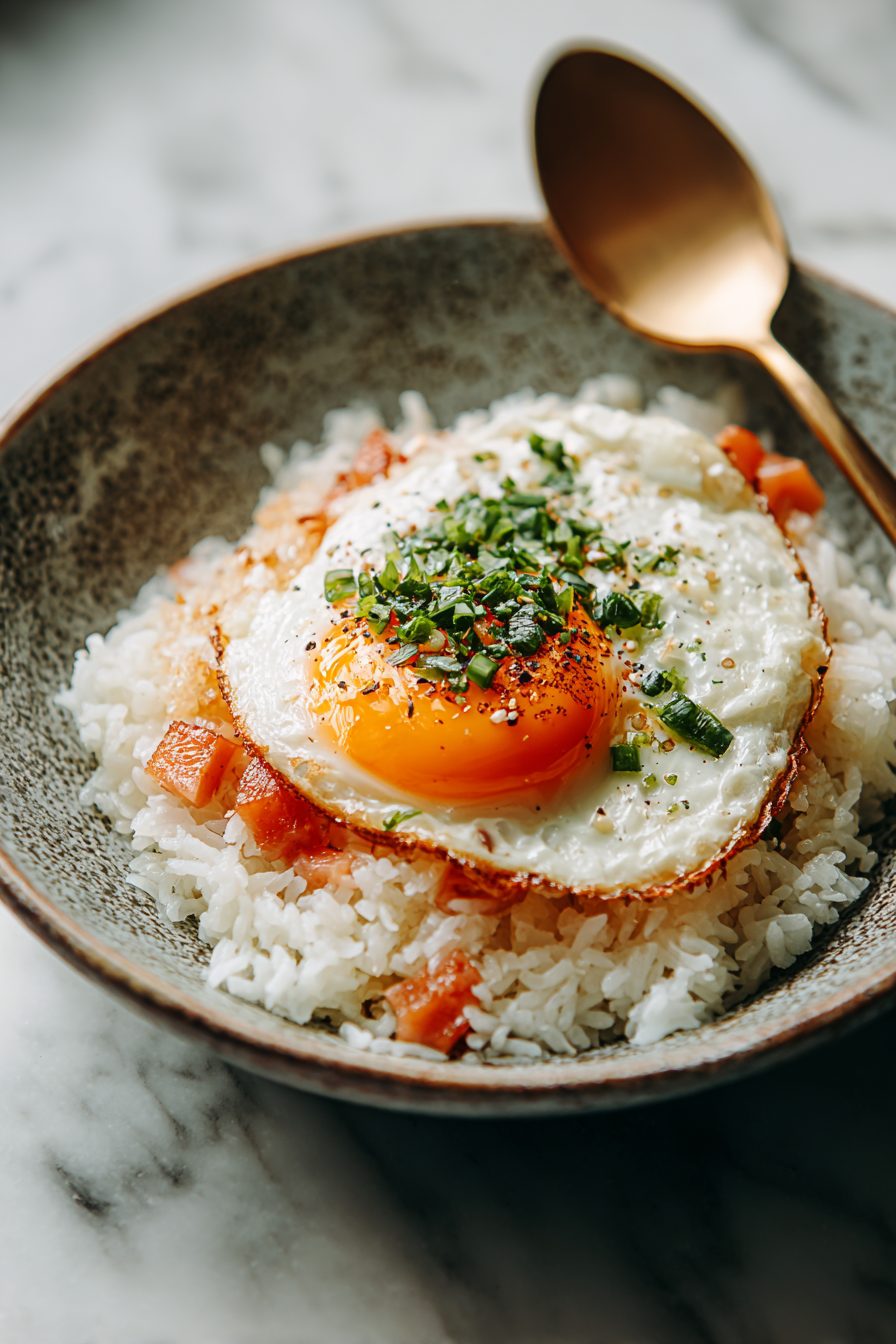 – Comfort food with texture: crisped edges on the Spam, soft rice, runny yolk, and a little crunch if you add scallions or furikake.