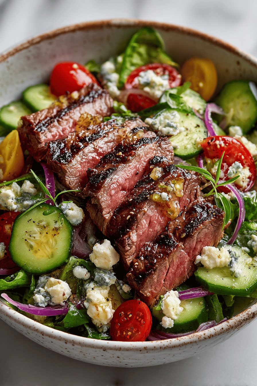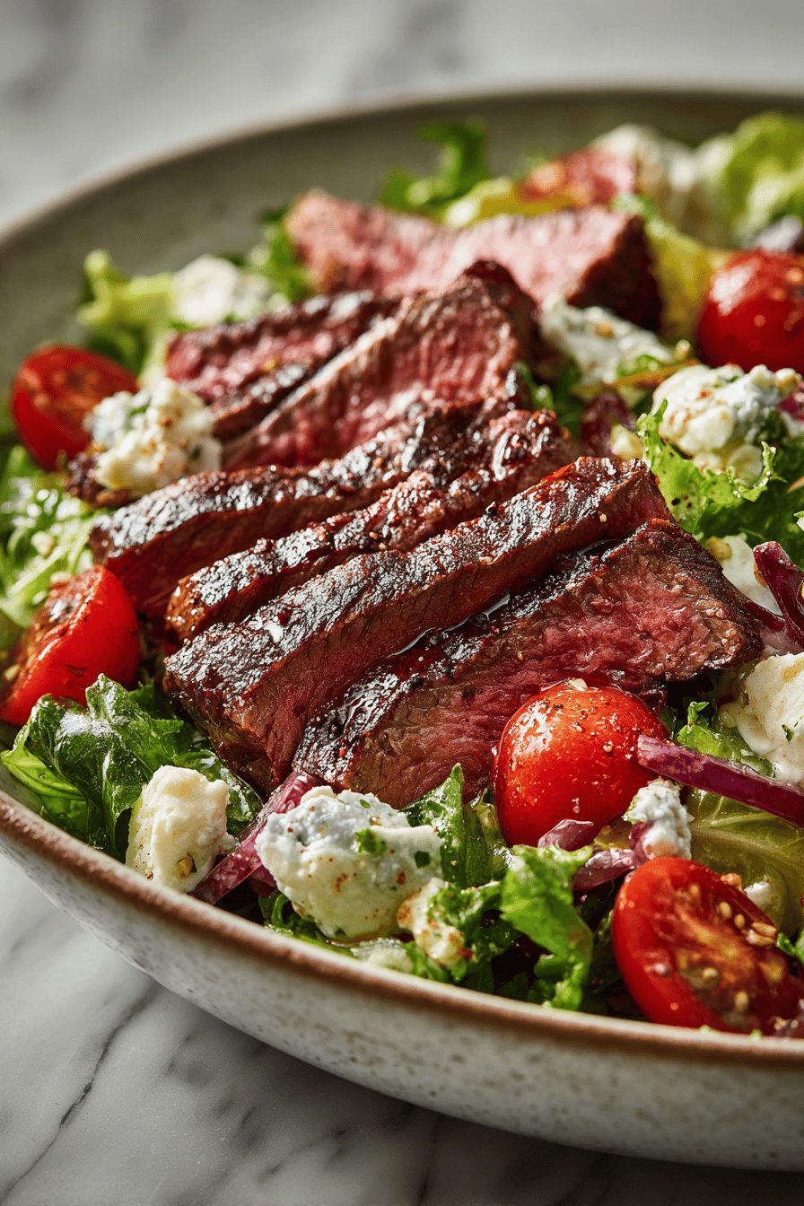 - Top with sliced steak, then scatter blue cheese and croutons. Serve right away.