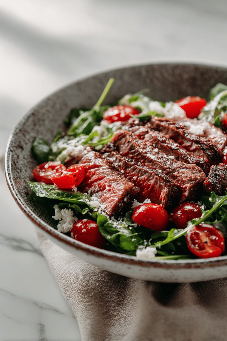 Leftovers keep okay in the fridge for 2–3 days if you store components separately: steak in one airtight container, dressed greens in another. If already tossed, accept that the leaves will soften — still tasty cold for breakfast with an egg on top, honestly. Reheat steak gently in a skillet or microwave in 20-second bursts so it doesn’t dry out.