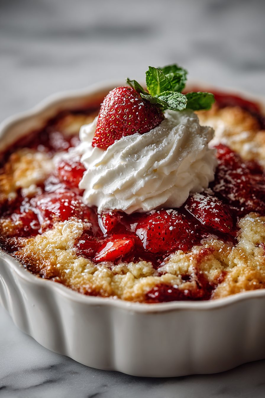 I’ve made this with whole strawberries, sliced strawberries, store-bought pie filling, and the time I tried it with frozen berries and a dusting of cornstarch to thicken — all good, different vibes. Once I accidentally used lemon cake mix instead of vanilla; it was surprisingly addictive, like a bright lemon-strawberry cheesecake. I also learned the hard way to not dump the whole stick of butter on top like a mad scientist — melt it and drizzle so it bakes more evenly. Also, don’t expect perfect edges; rustic is the aesthetic here.
