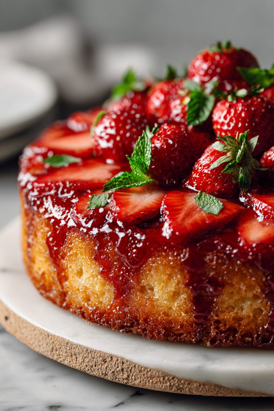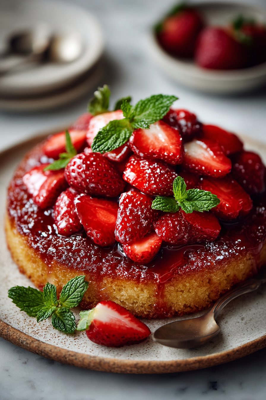 I swear this cake is forgiving, but it has personality. The first time I made it I underbaked it by three minutes and my husband declared it “saucy” and ate it with a fork on the couch. Another time I used frozen strawberries because the grocery had none and it worked — but they released water and made the caramel a little thinner, so I browned the butter until it smelled nutty and it saved the day.