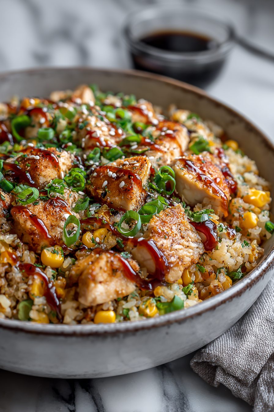 Leftovers love the fridge: separate rice, chicken, and toppings into containers so you can reheat just what you need. They’ll keep a few days; reheat gently in a skillet with a drizzle of oil or a splash of water to revive the rice. Cold bowls are not shameful — I’ve eaten this right from the fridge for breakfast with an over-easy egg on top and felt very grown-up about it.