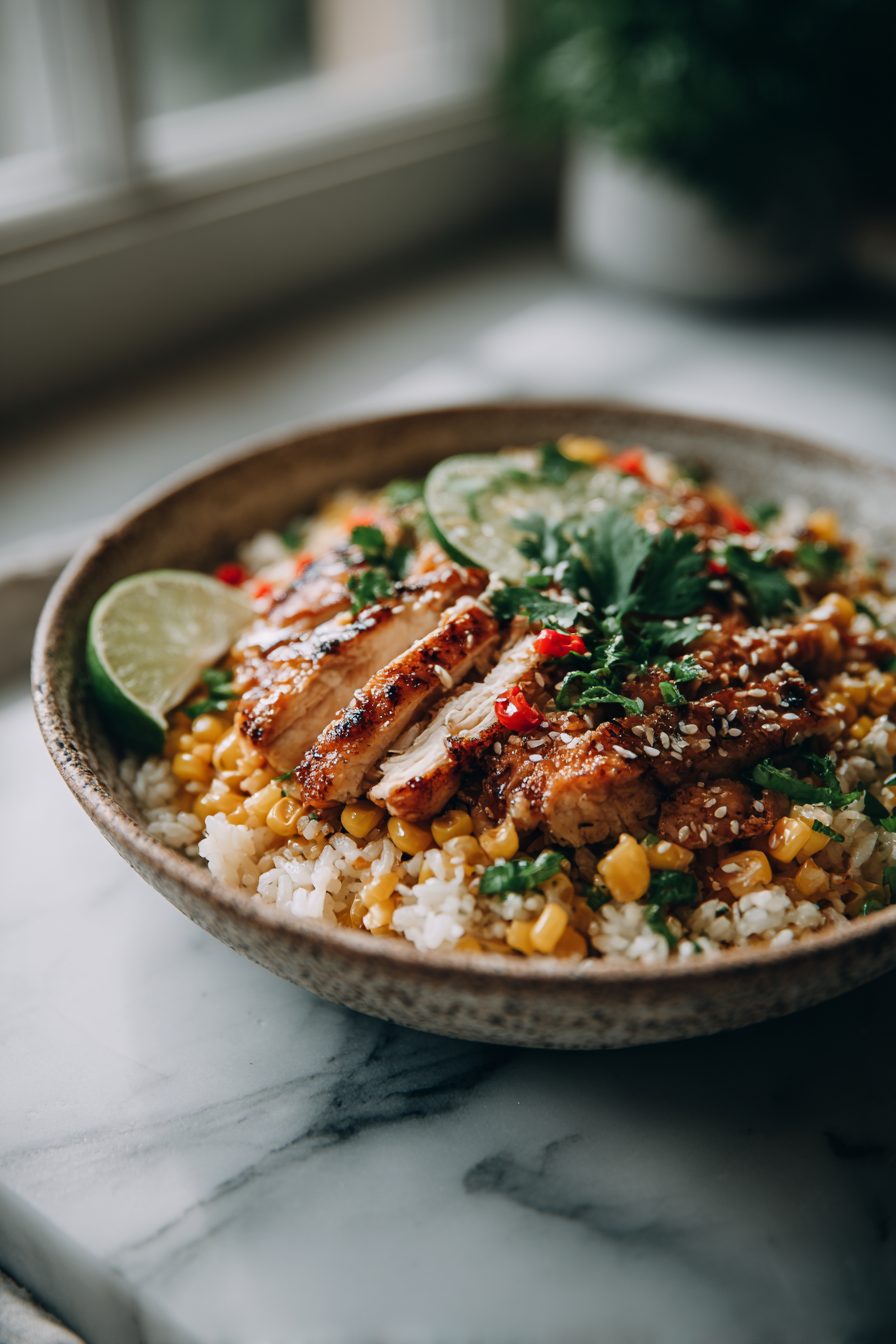 This bowl is the kind of dinner that feels like a mini street-food party in your kitchen — charred sweet corn, smoky-ish chicken, tangy crema, and rice that soaks up all the good stuff. It’s easy, messy, and exactly what I reach for when I want something that tastes like effort even on a weeknight when the house is chaotic.