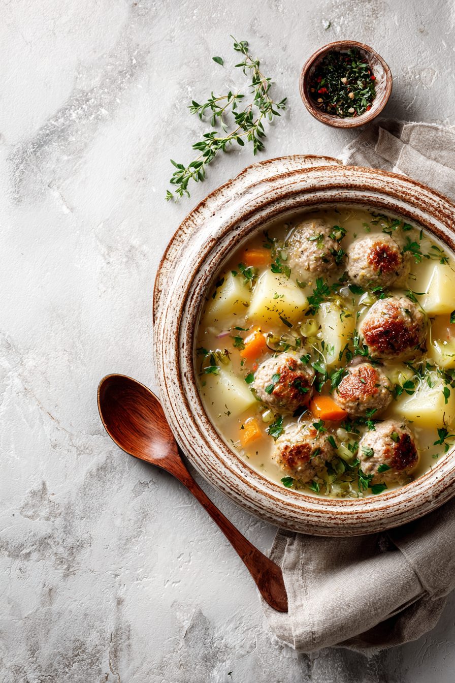 I always make a mess when I make this soup — breadcrumbs in the sink, one meatball that falls apart, a child who “helps” and ends up eating half the onion. Once I browned the meatballs so enthusiastically they stuck to the pan and made crispy little nuggets — the family declared those “bonus bacon.” I’ve also tried it with grated apple in the meatballs (old-school Swedish trick) and it gave the meatballs a faint sweet lift that made my mother-in-law suspiciously pleased. The broth tolerates improvisation: if you skip the cream, add a splash of milk and a spoonful of butter and no one will notice.