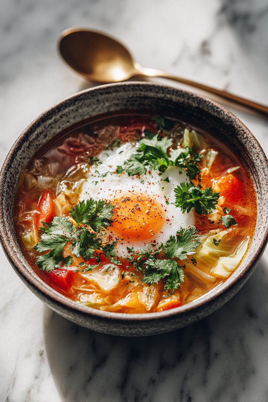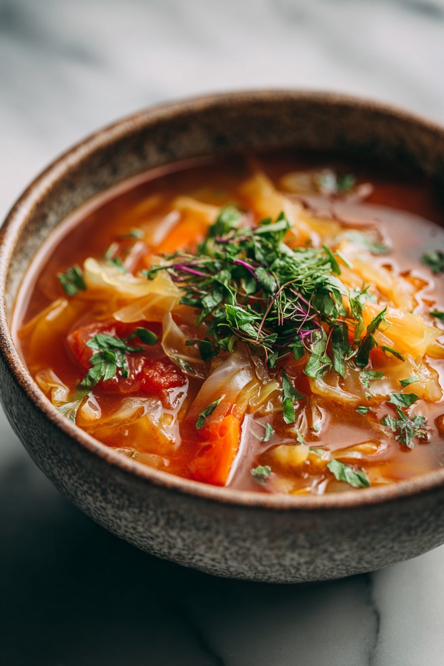 I’m not going to pretend this soup is dainty — it’s loud, tangy, cabbage-forward, and somehow cozy enough to spoon straight from a big bowl while standing over the sink. Think sweet-and-sour vibes without the takeout guilt: shredded cabbage, a little tomato brightness, a hit of vinegar and sugar, and whatever stock and pantry stuff you have on hand. It comes together fast, warms you up, and makes the whole house smell like a grandma’s kitchen with a modern twist.