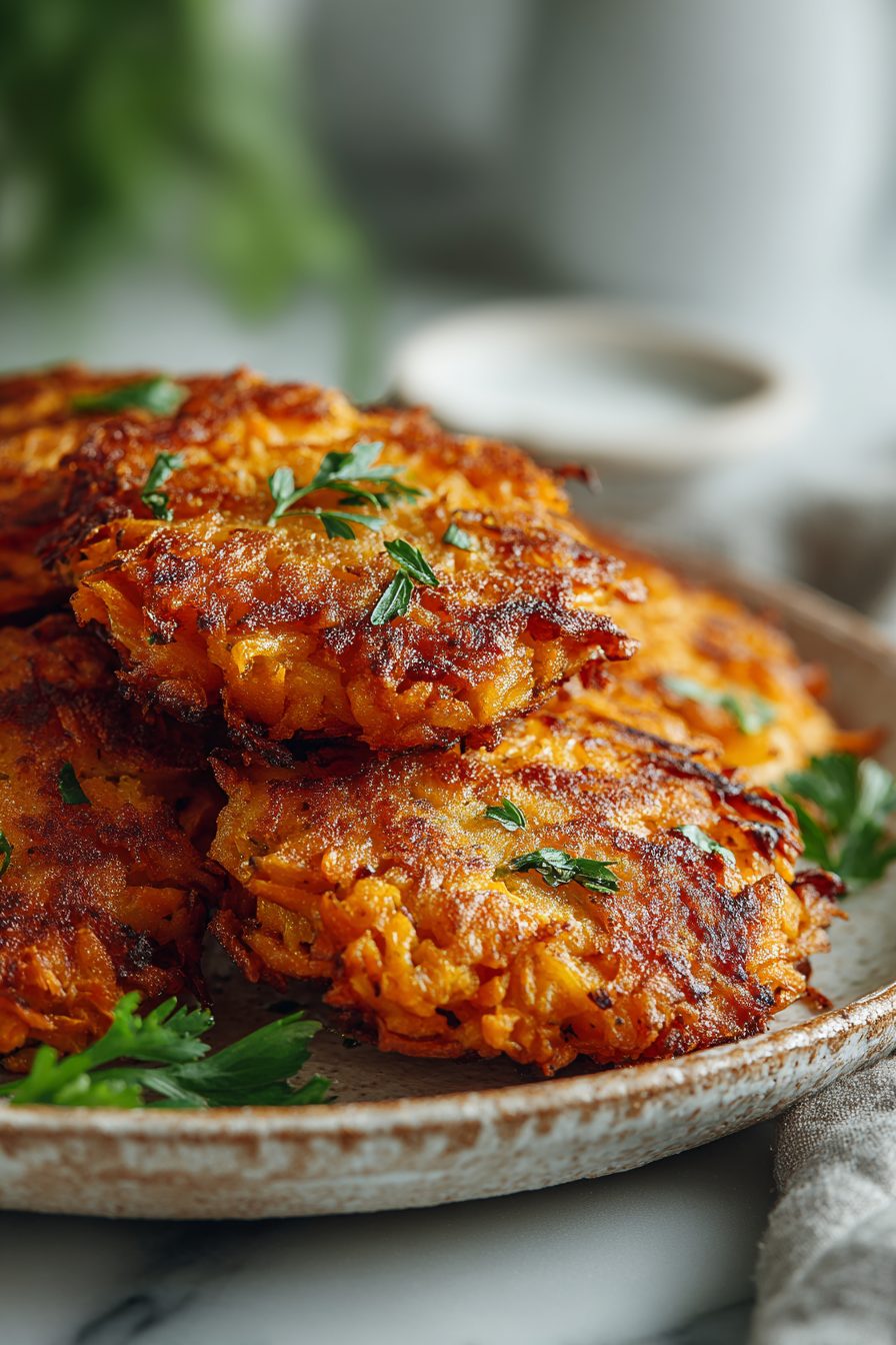 – Shred the sweet potatoes a day ahead and store them in a bowl covered with a damp towel in the fridge; squeeze dry just before cooking.