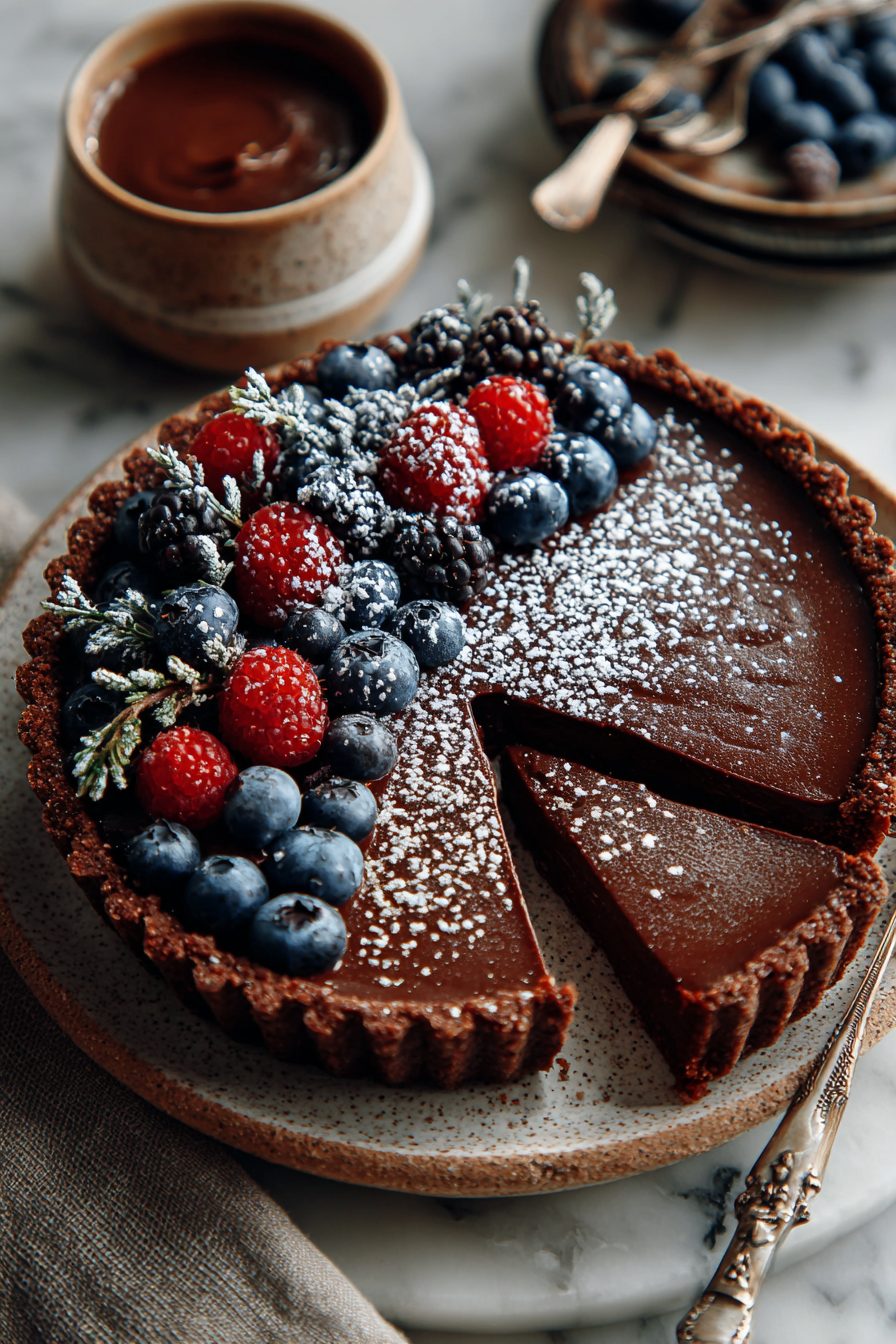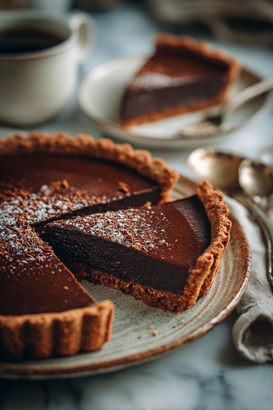 This tart is the kind that makes you stop mid-scroll, shove your phone aside, and actually make dessert—because it’s rich, chocolatey, and somehow light enough that you can rationalize a second slice. It’s vegan, which means no eggs or dairy drama, but still glossy and decadent thanks to a silky ganache-like filling and a crunchy, slightly nutty crust.