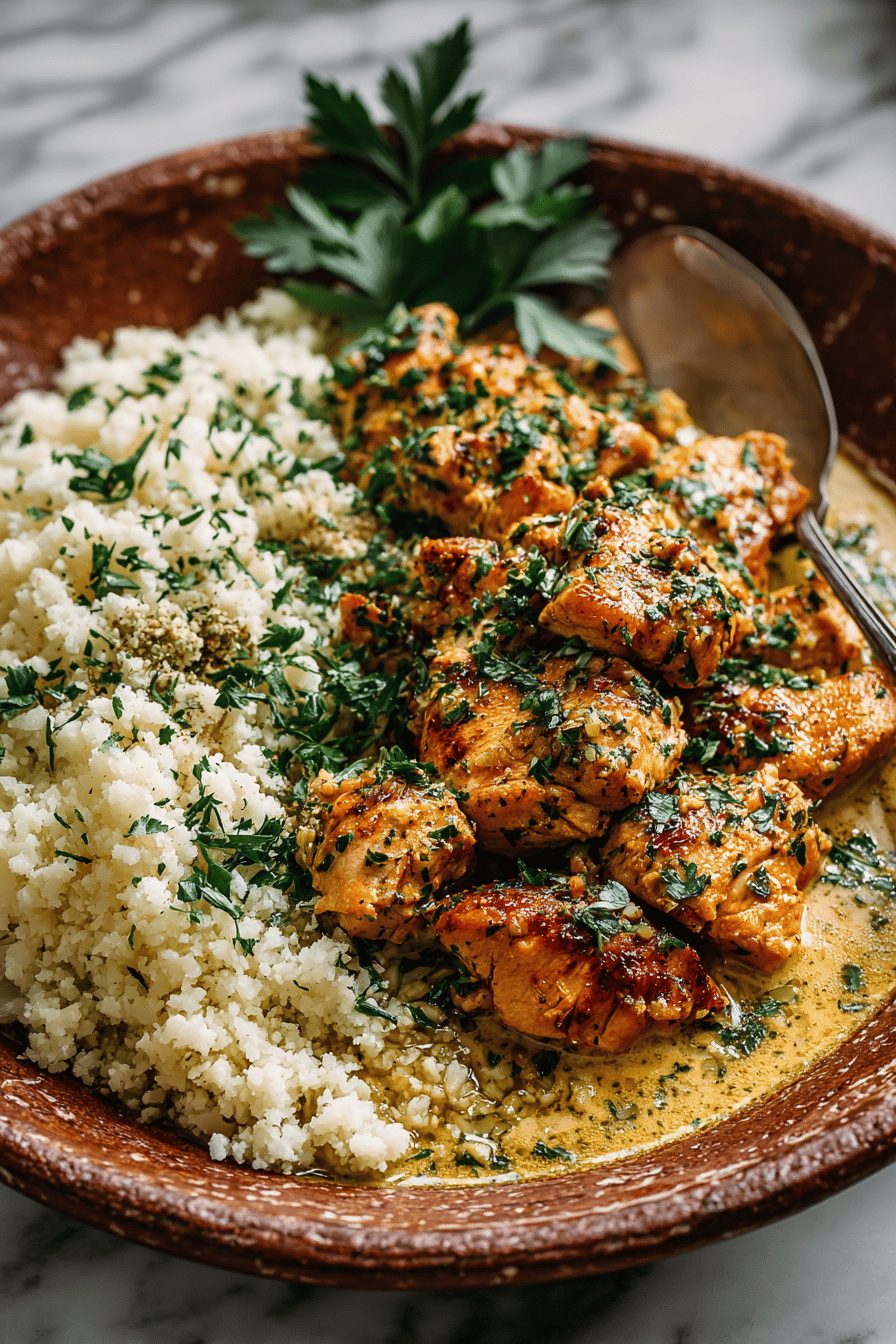 Okay, listen: this is garlic-butter chicken slapped over cheesy, lemony cauliflower rice and it’s everything you didn’t know your weeknights needed. It’s cozy, a little indulgent, and stupidly easy — all the buttery, garlicky goodness of a restaurant dish without the elbow rub and tiny portions.