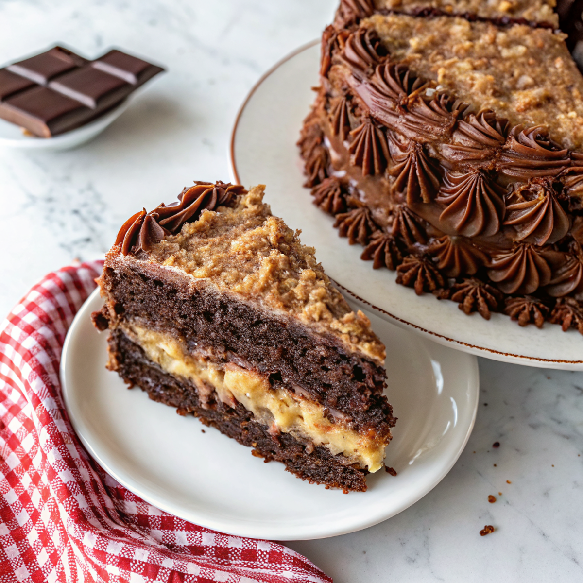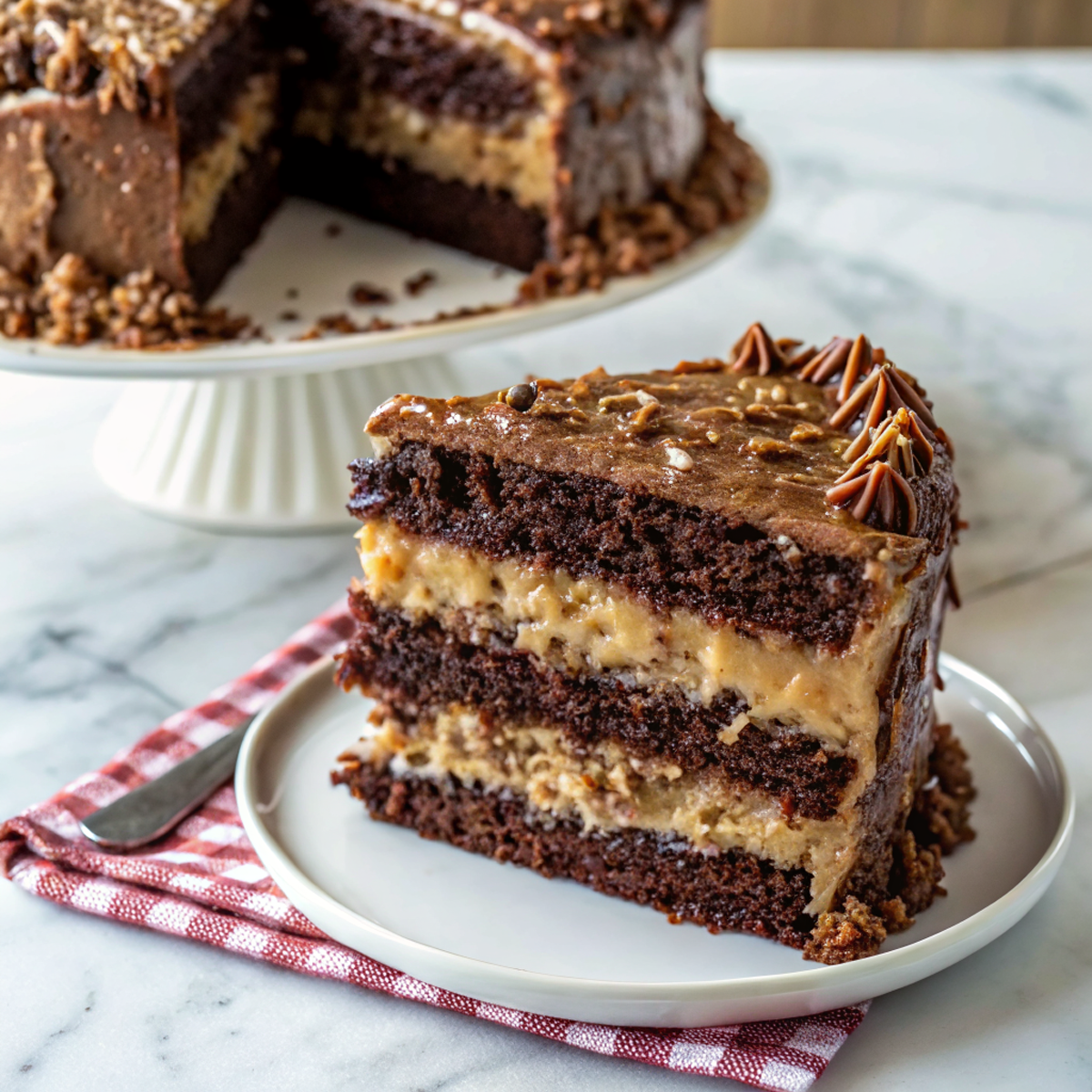 - Assemble: Place one cake layer on a stand. Spread half of the coconut–pecan filling over the top, stopping 1/2 inch from the edge. Chill 10 minutes to help it set, then top with the second layer. Apply a thin crumb coat of chocolate buttercream around the sides; chill 10–15 minutes. Finish the sides with a smooth final coat of buttercream. Spoon the remaining coconut–pecan filling over the top and gently nudge to the edges, leaving a small border. Slice and serve.