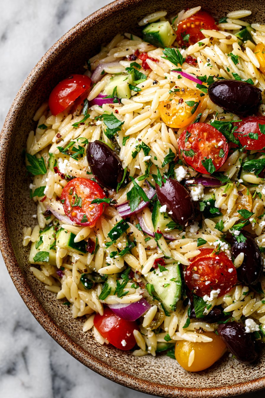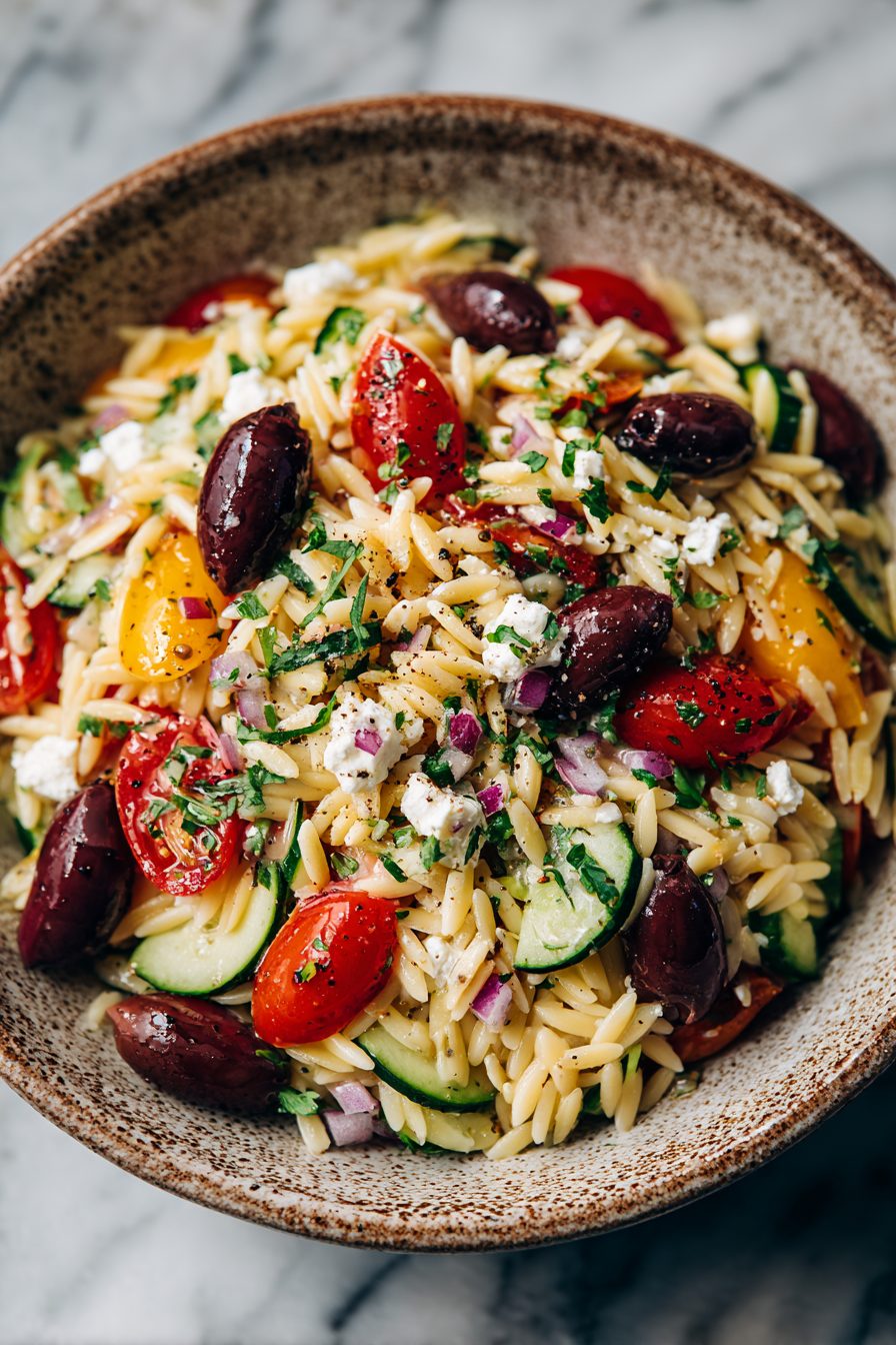 Swap orzo for couscous or pearl barley if that’s what’s in the pantry. Feta can be replaced with goat cheese for creaminess or a vegan feta for a dairy-free option. Add chickpeas or grilled chicken for protein. If you hate olives, try capers or roasted red peppers — I’ve done both, and the salad forgives you.