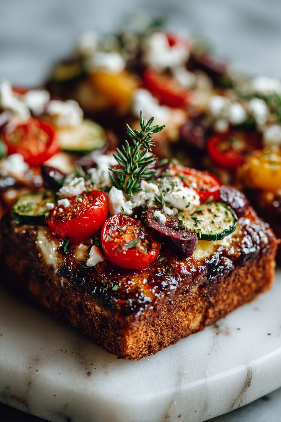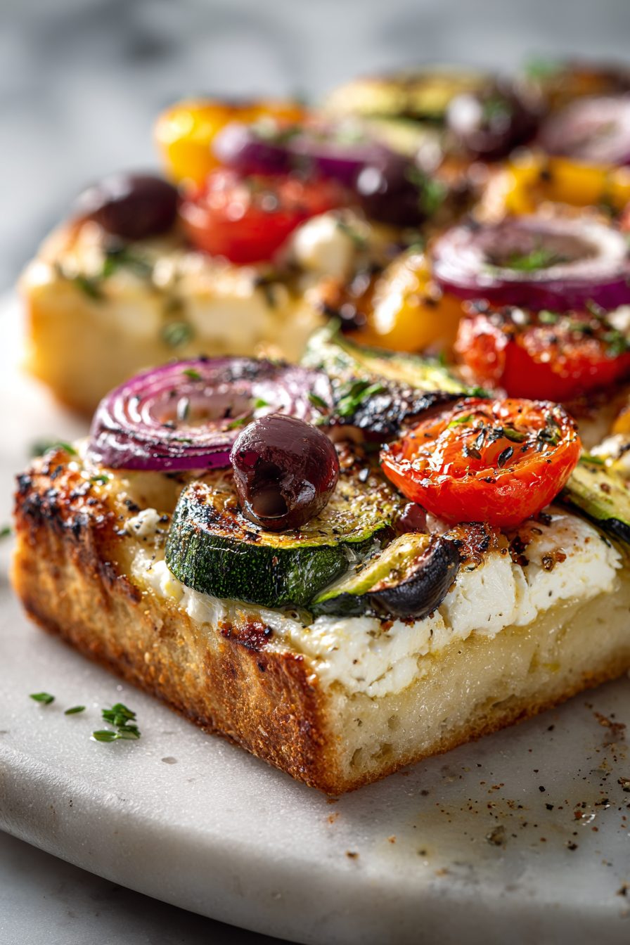 This square thing is basically pizza and a veggie party getting hitched and deciding to never leave each other. It’s a sheet-pan style Greek Veggie Pizza Square — tangy feta, melty mozzarella, bright lemony oregano vibes, roasted peppers and red onion, and olives doing their salty thing. It’s great for feeding a crowd, scrambling a weeknight dinner into something that feels joyful, and for using up every sad pepper and handful of spinach in the fridge.