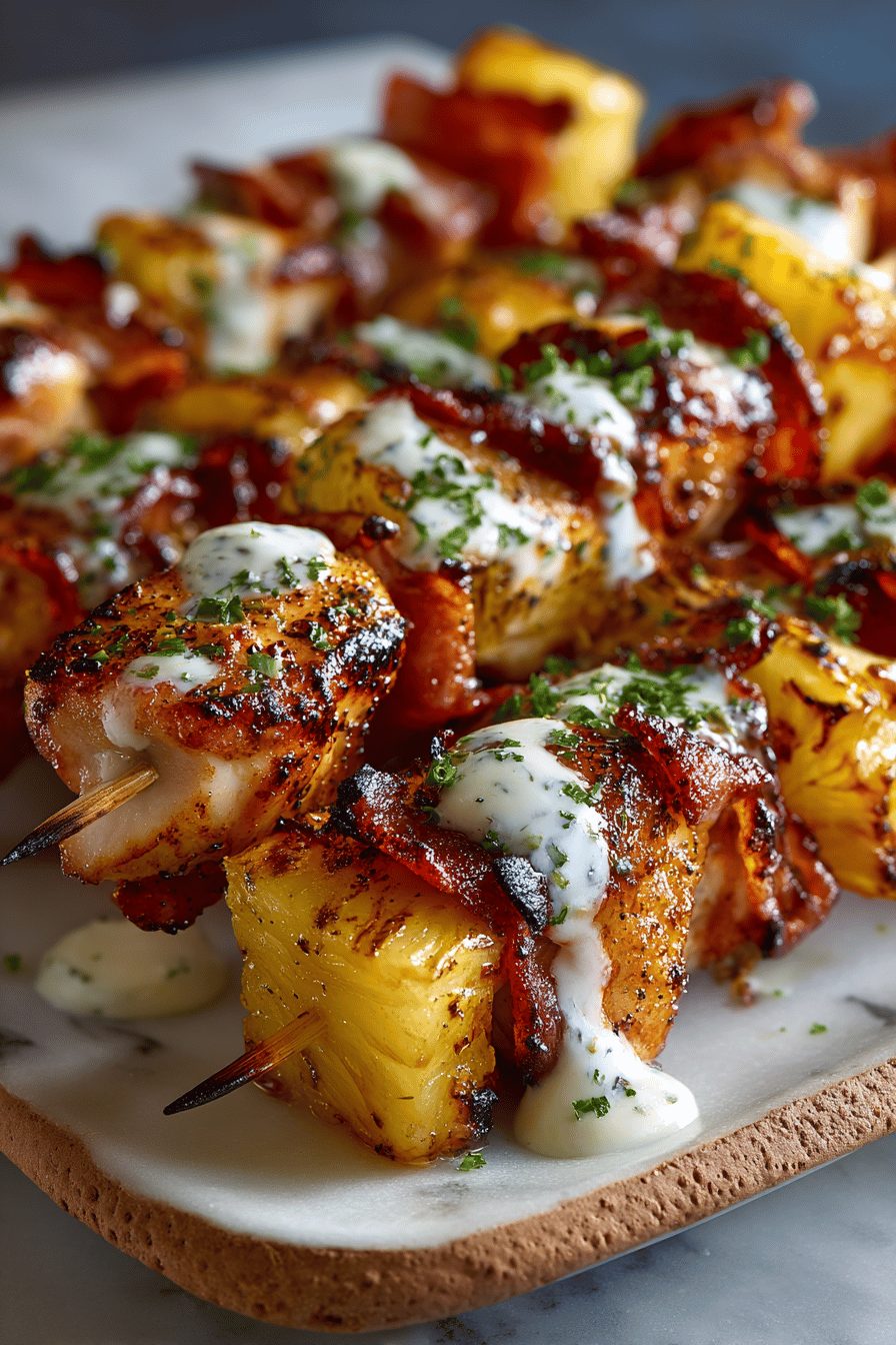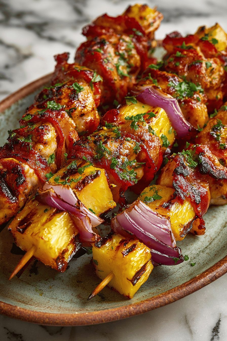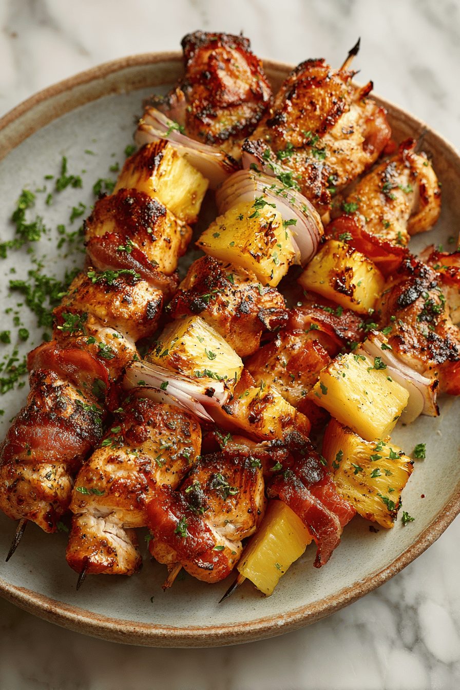 This is the kind of messy, sticky, sweet-and-salty thing I make when I want dinner to feel like a backyard party but without the effort of entertaining. Think skewers studded with smoky bacon, juicy chicken, and caramelized pineapple that sing together — salty, tangy, a little char, and impossible not to eat with your hands. It’s simple, crowd-pleasing, and forgiving if you’re multitasking or slightly distracted (which is always me).