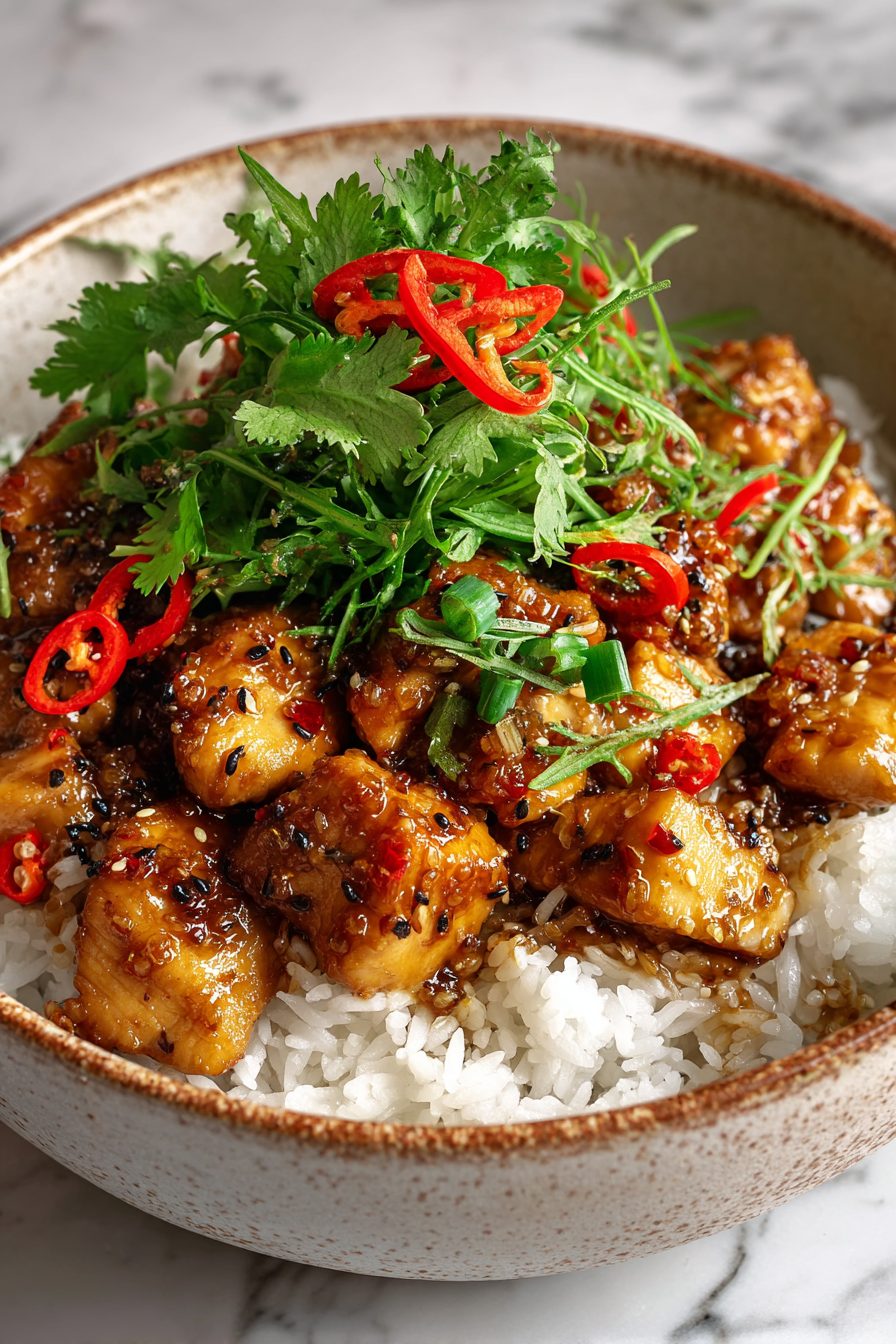 - Finish with green onions, sesame seeds, and red pepper flakes if using. Serve hot over steamed rice.