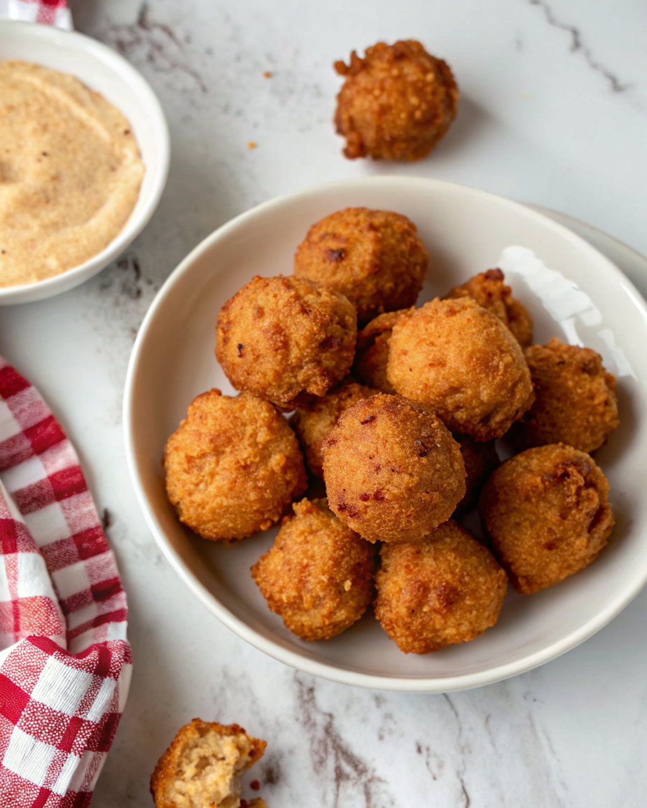 Leftovers: store in an airtight container in the fridge for 3–4 days. Reheat in a 350°F oven or air fryer for a few minutes to bring back the crunch. Eating them cold is fine (no shame)—they’re great with a smear of mustard for breakfast or crumbled over a salad. Avoid microwaving unless you don’t mind a soggy, sad hush puppy.