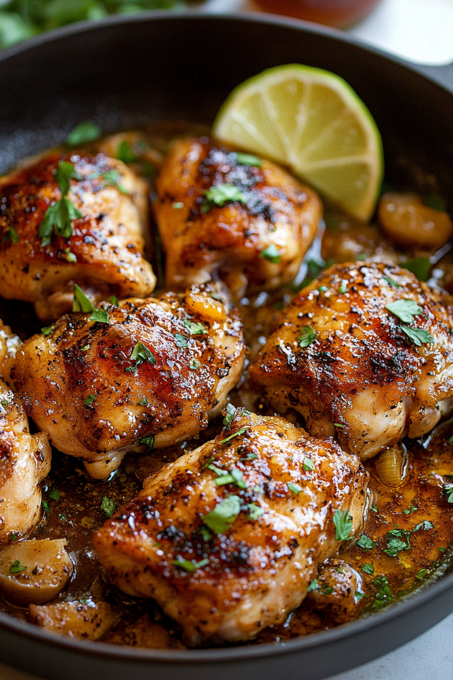 Stir the honey and soy sauce into the skillet. Let the sauce simmer and reduce for about 5 minutes, allowing the flavors to meld. Return the chicken to the skillet, spooning the sauce over the thighs to glaze them beautifully.