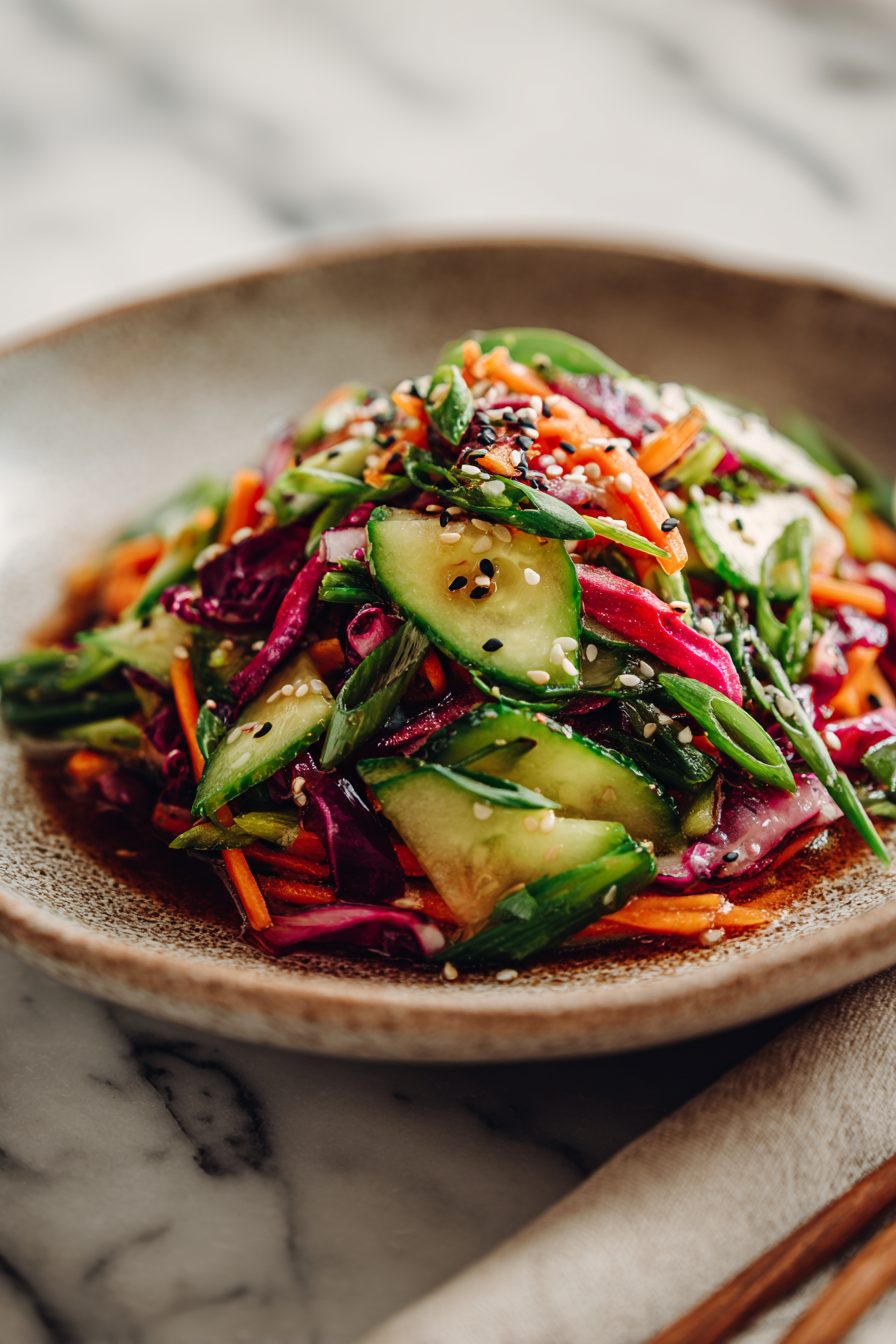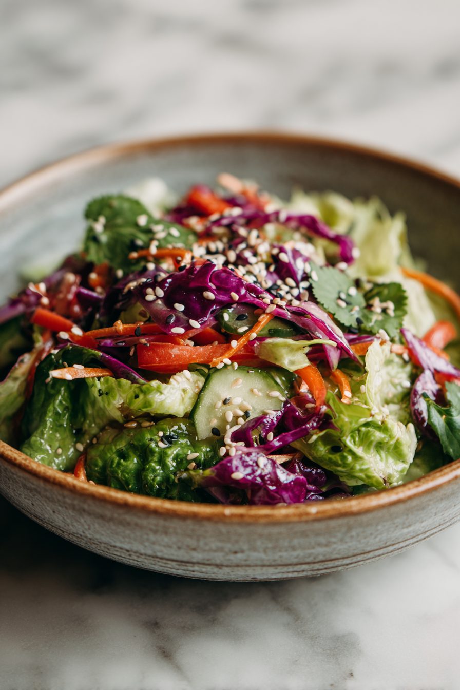 This salad is the crunchy, sesame-saucy, slightly sweet-and-sour thing I make when I need something that feels fancy but is mostly just vegetables being their best selves. Think layers of crisp cabbage and greens, ribbons of carrot and cucumber, toasted sesame, and a tangy sesame-ginger dressing that somehow makes everything taste like a weekday victory. It’s bright, textural, and lives happily in a big bowl for sharing (or not sharing — I won’t judge).