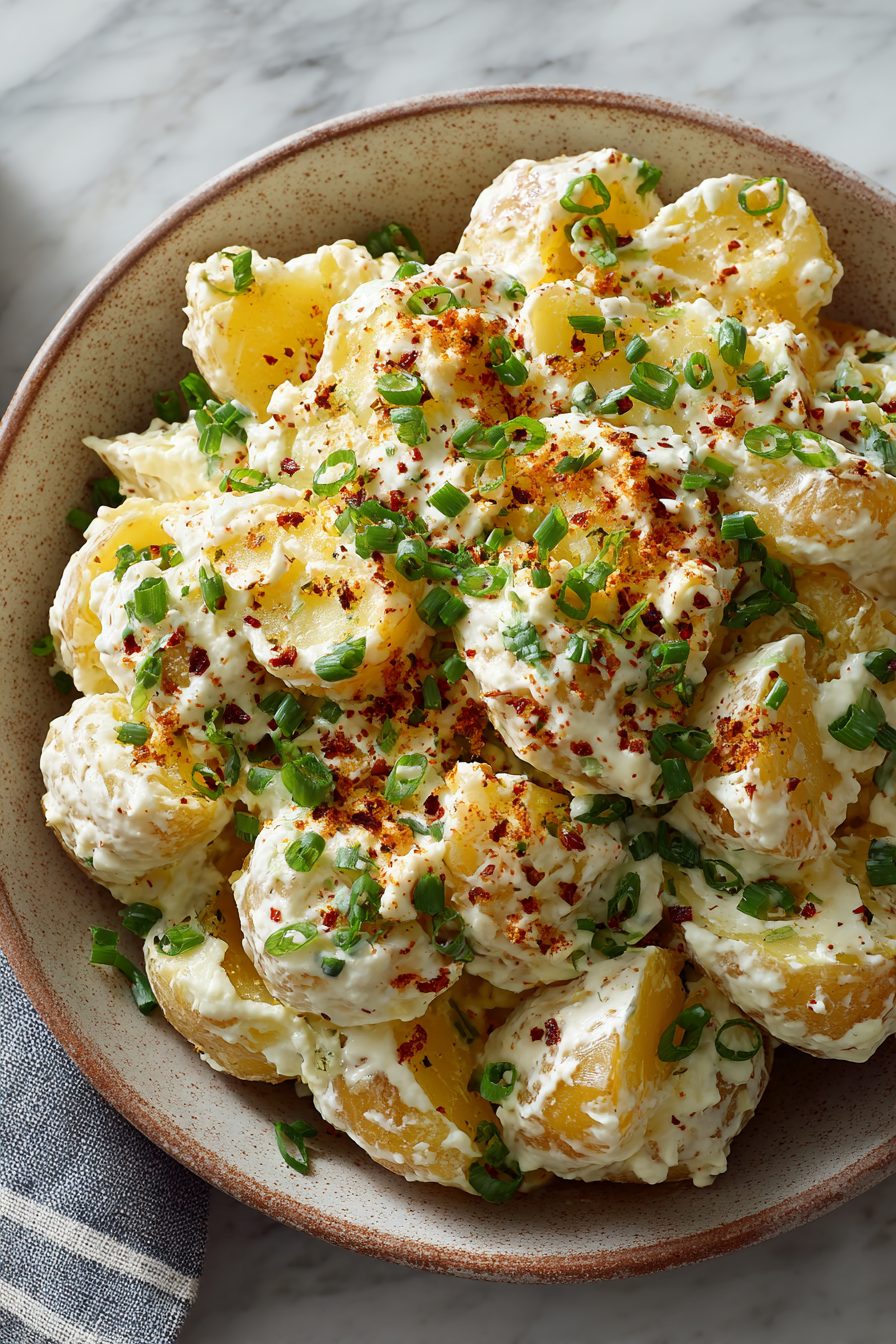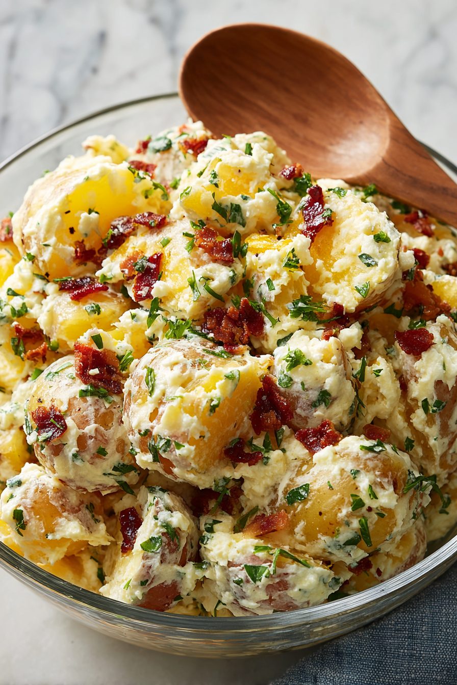 This one’s kind of my kitchen comfort blanket. I learned the hard way that boiling potatoes too long makes them fall apart into sad mash — nobody wants that. I like to toss the skins on a sheet pan and crisp them for snackable potato chips; it’s a problem if you’re tired and hungry. Once, I forgot to salt the dressing and the family staged a polite revolt until I added a generous pinch. Also: bacon crumbs are basically currency in this house.