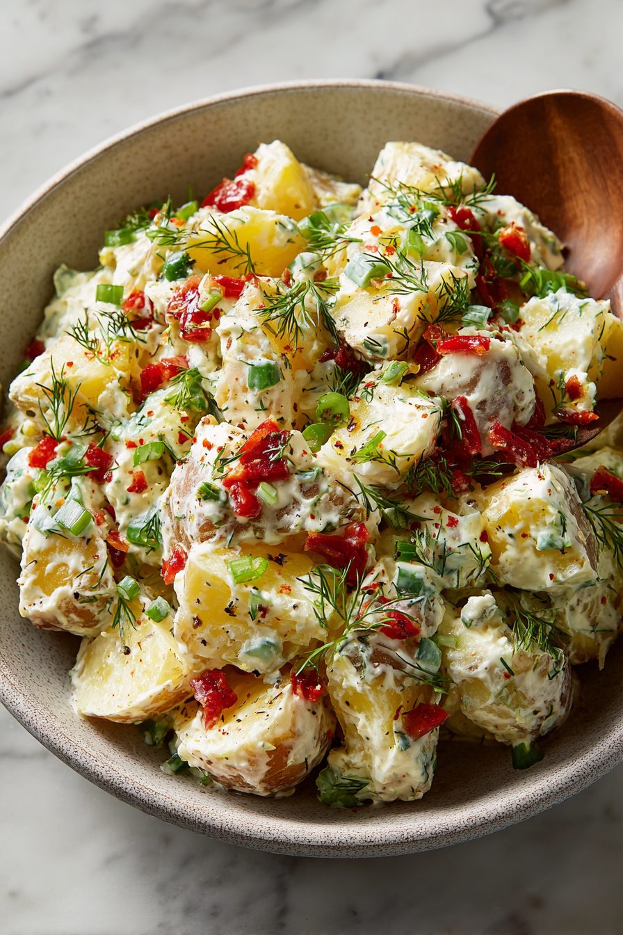 My husband is convinced this salad is how I propose to him again and again. He’ll stroll in, sniff the room like a bloodhound, and ask if I “made the potato thing.” Our toddler now points at bowls and shouts “bacon!” like it’s a national anthem. It’s become a staple at potlucks, backyard cookouts, and the nights when we both forgot to plan dinner and somehow end up eating a giant bowl while standing at the counter. Once I swapped plain Greek yogurt for half the mayo on a whim and everyone pretended it was the plan all along.