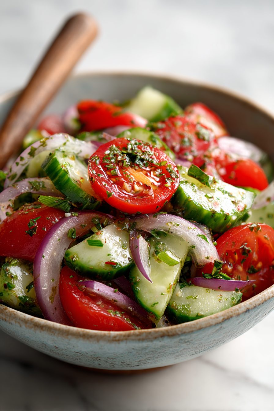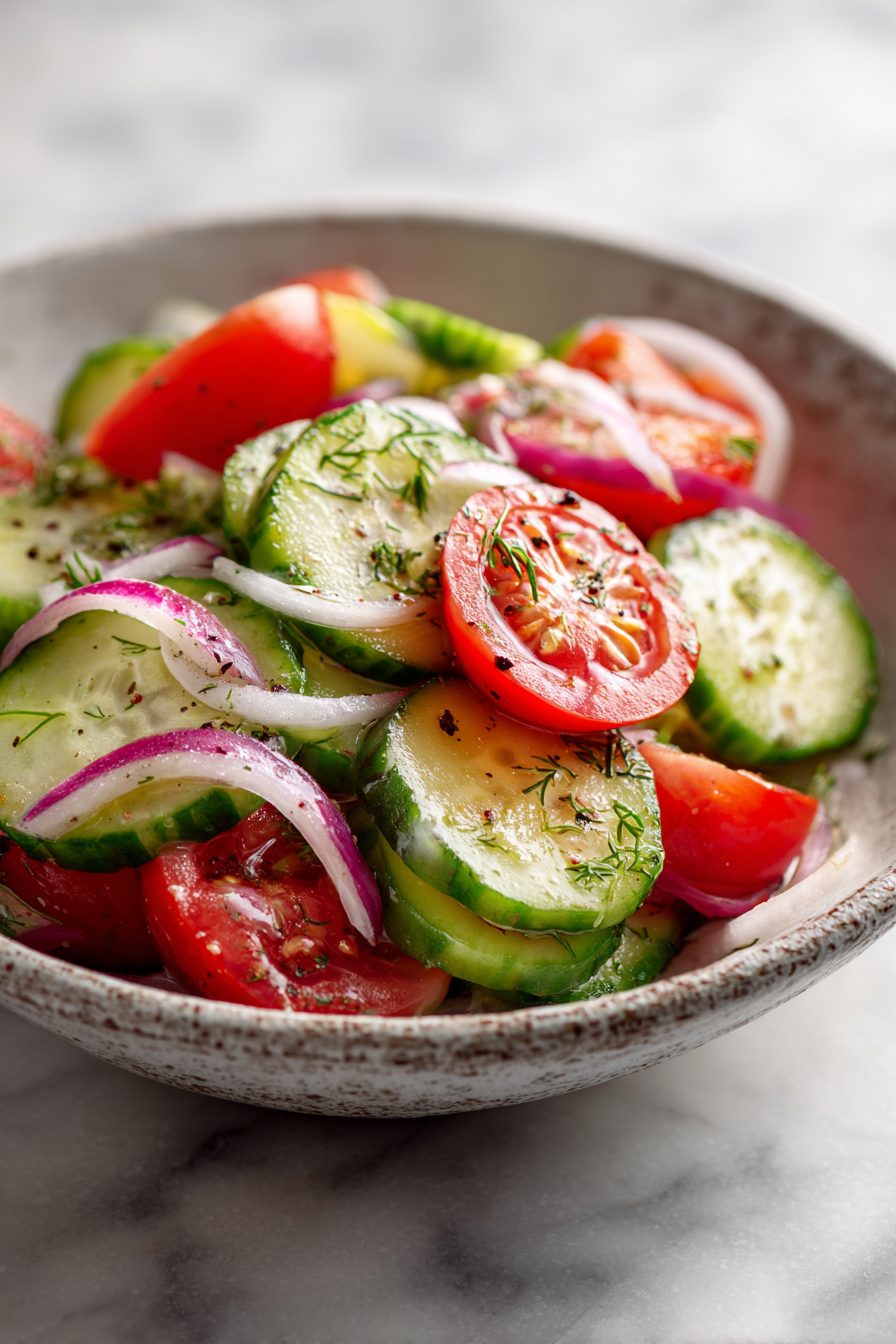 Bright, simple, and exactly what I wanted on a hot evening — the cucumbers stay crunchy, the tomatoes add juicy sweetness, and the tangy marinade ties everything together without fuss. I let it chill an hour and it tasted even better the next day, making it a dependable, make-ahead side for BBQs or weeknight dinners.