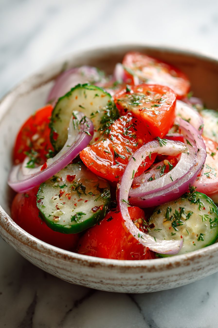 I’ve made this with every kind of cucumber under the sun—English for fuss-free slicing, little Persian guys when I want extra crunch, and the big garden ones that need their seedy centers scooped. If the onion feels aggressive, I give the slices a quick cold-water bath while I mix the marinade and they chill right out. I’ve tried it with balsamic and… we’re still friends, but it turns the whole thing muddy. Red wine vinegar or apple cider vinegar keep it bright. Dill makes it classic, basil makes it dreamy, and mint is the unexpected “why is this so fresh?” moment. I once forgot the oil and it tasted like salad punishment; don’t be me—just a glug makes the acid behave. Also, if your tomatoes are a little meh, a pinch of sugar or honey is magic. Not dessert-y, just balanced.