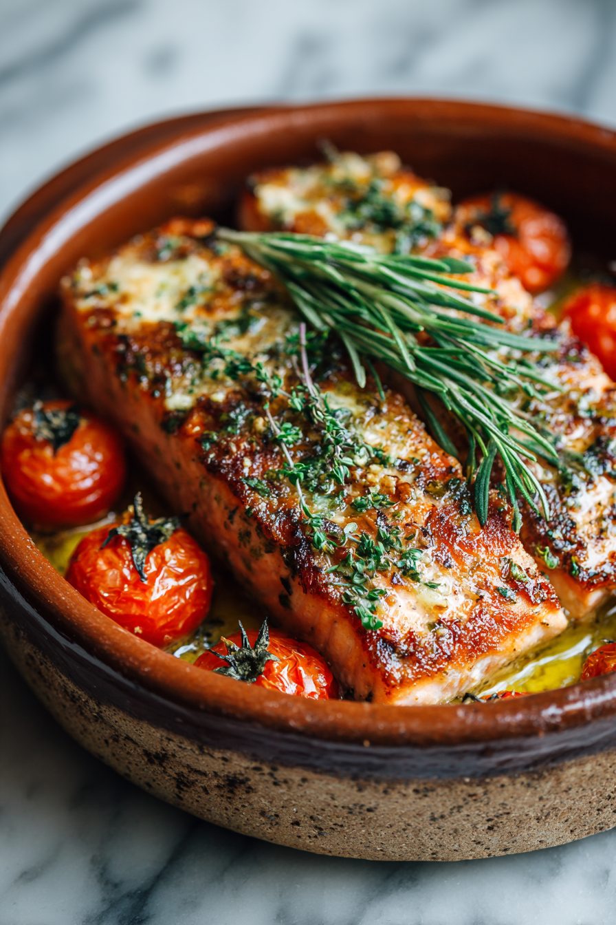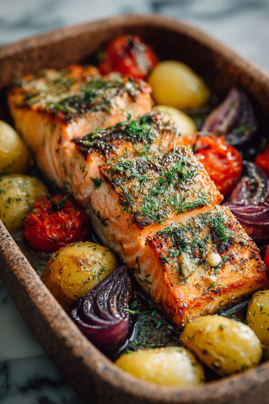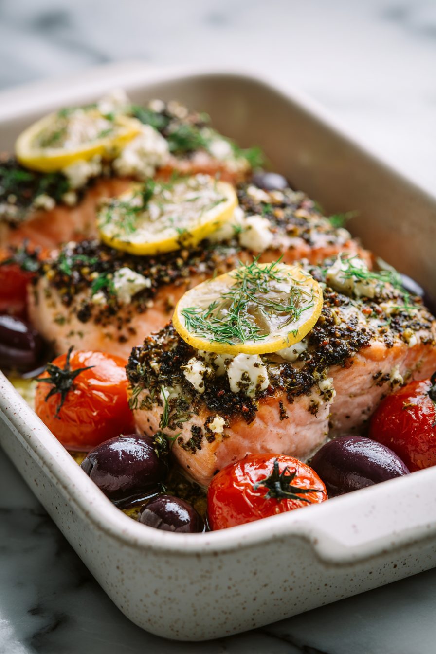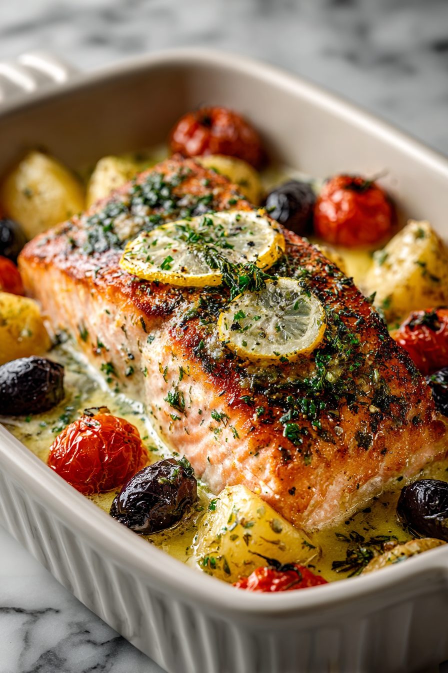 I am embarrassingly attached to this salmon dish — it’s simple, bright, and feels like a vacation on a sheet pan. Flaky salmon roasted with cherry tomatoes, olives, onions, lemon and a scattering of feta; everything mingles in the oven so you get that gorgeous, slightly caramelized tomato sweetness against rich fish and salty bites. It’s one of those “looks fancy, cooks itself” dinners that actually never judges you for opening a bottle of wine mid-roast.