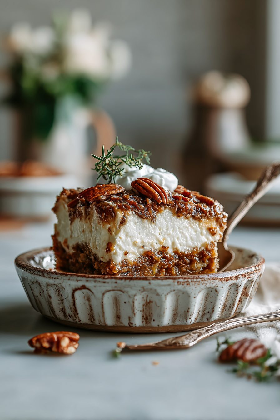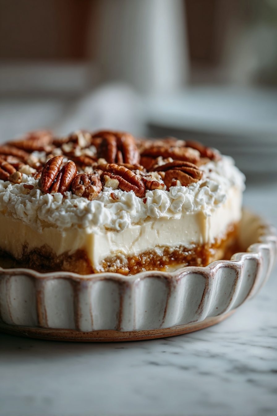 This no-bake pecan pie lasagna is basically the dessert of all leftovers-meet-showstoppers: a crunchy graham-cookie-ish base, a soft cream–cheese/pudding layer, gooey caramel, and a mountain of toasted pecans on top. It looks fancy, but it’s mostly assembly, a little chilling time, and way less stressful than a stand mixer tantrum at midnight.