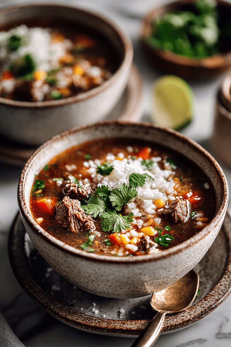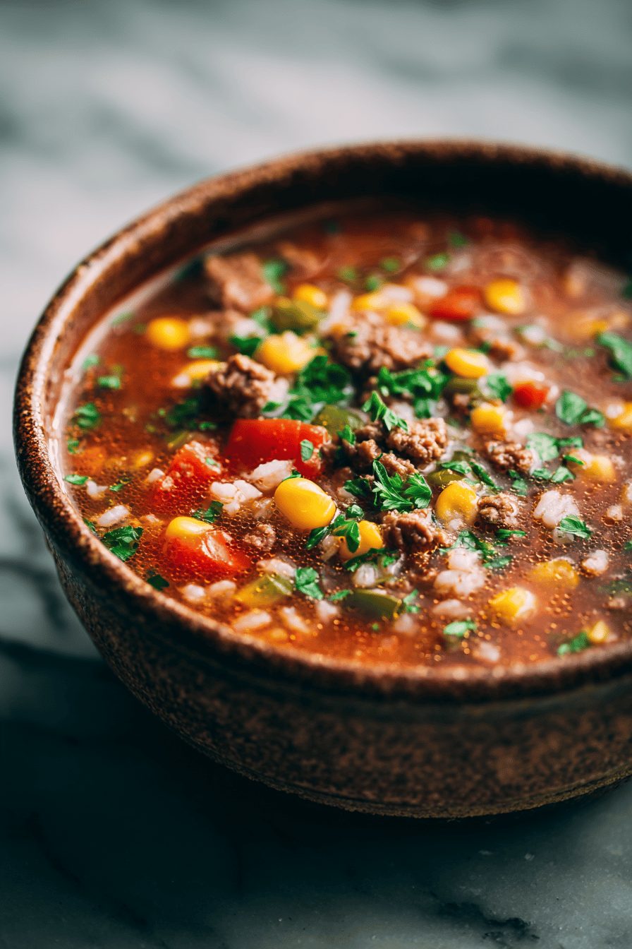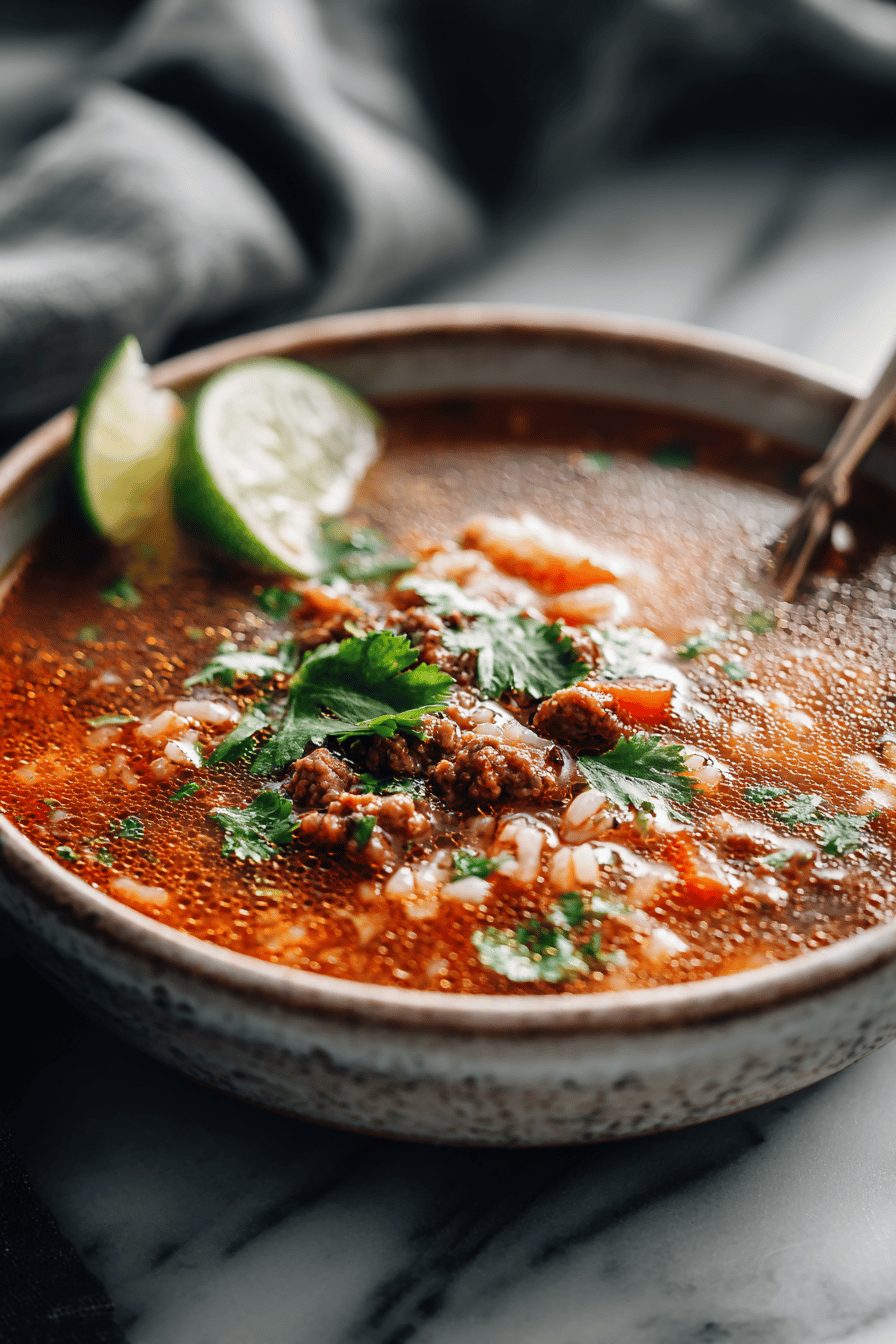 Hearty ground beef, tender rice, and bright Mexican spices simmer together in one pot for a cozy, weeknight-friendly soup. Fresh lime and cilantro add a zesty finish.