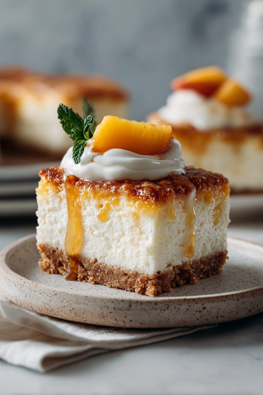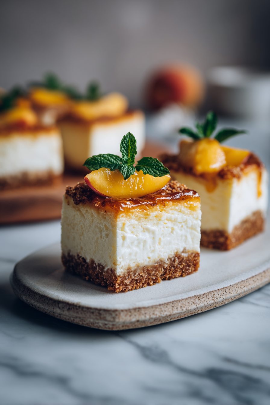 This is one of those summer desserts that feels like a hug and a picnic and a tiny bit of troublemaking all at once — creamy cheesecake filling swirled with peach jam sitting on a buttery shortbread-ish crust. It’s not fussy: bright ripe peaches do the heavy lifting, the texture is silky without being snooty, and the bars travel well for backyard parties or lazy weekday dessert moods.