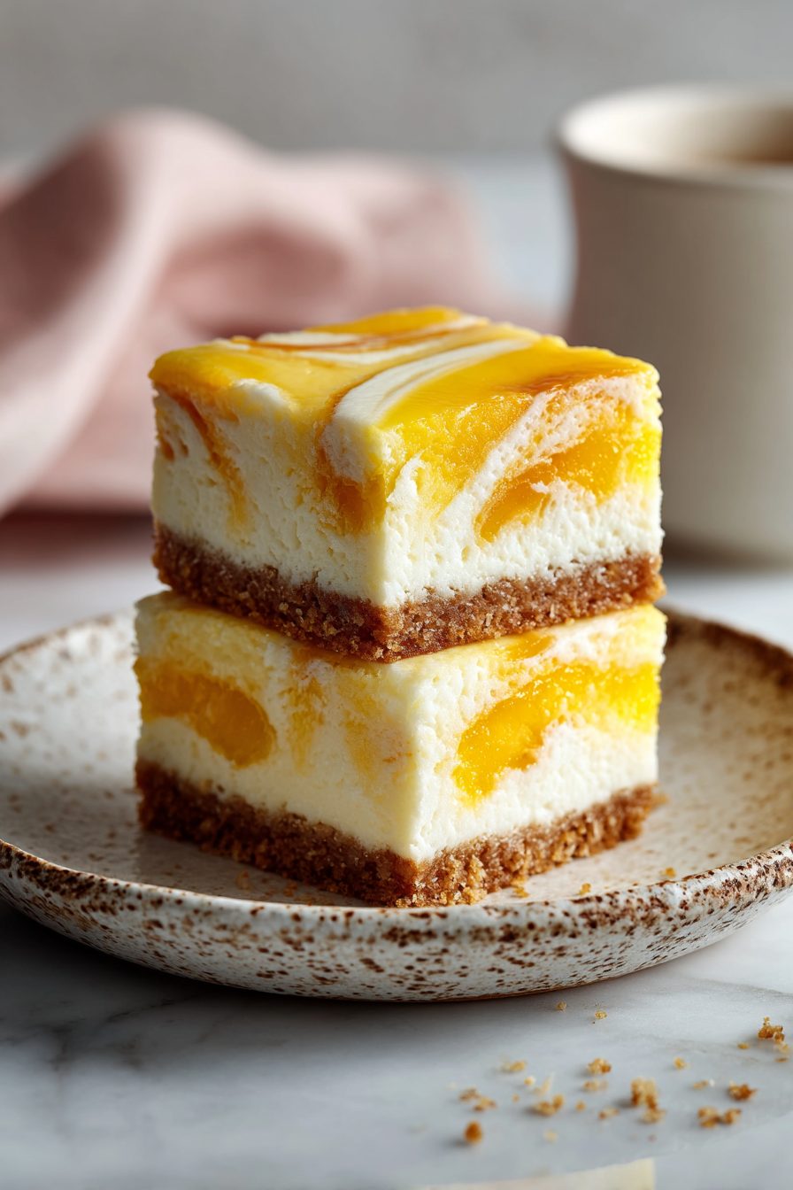 This is one of those summer desserts that feels like a hug and a picnic and a tiny bit of troublemaking all at once — creamy cheesecake filling swirled with peach jam sitting on a buttery shortbread-ish crust. It’s not fussy: bright ripe peaches do the heavy lifting, the texture is silky without being snooty, and the bars travel well for backyard parties or lazy weekday dessert moods.