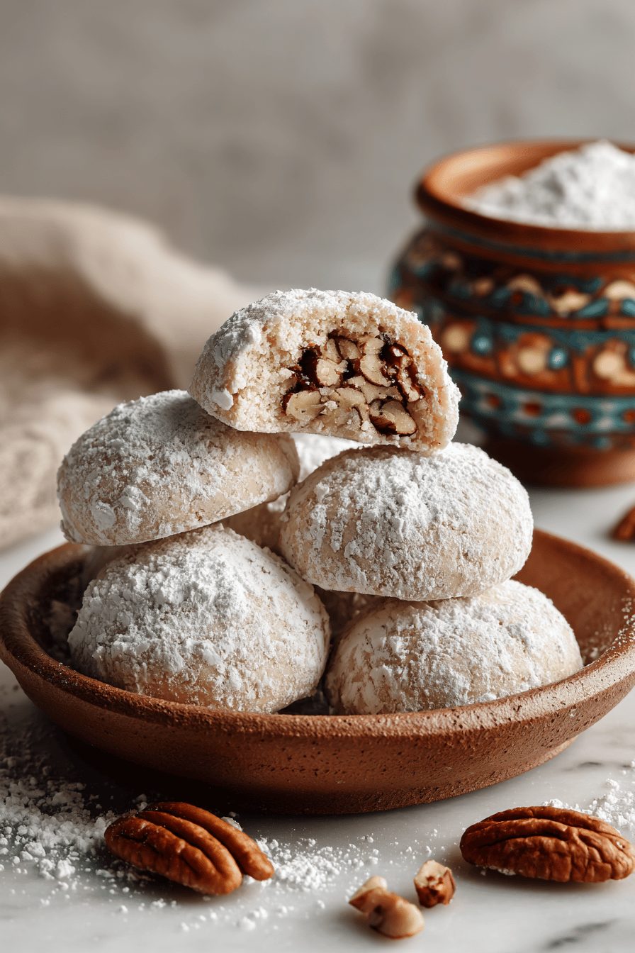 These are little, snowy, buttery pecan cookies that look like they belong on a holiday mantel but somehow became our Tuesday-night emergency dessert. They’re tender, nutty, dusted in powdered sugar so they melt in your mouth like tiny sugar clouds — and they’re ridiculously easy to make even when you’re juggling kids, a dog that thinks every dropped crumb is a gift, and a husband who “forgets” to set the oven but remembers to eat three before dinner.